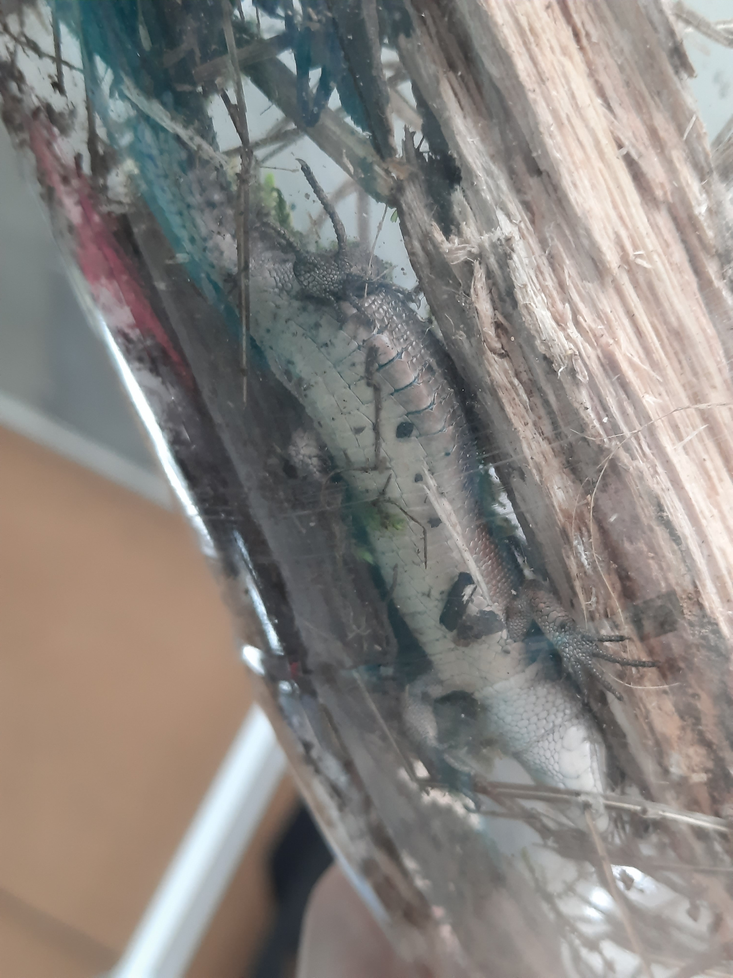 A lizard is inside a transparent container, lying on its back among wood and twigs. The location is Krasnogorskoye, Russia.