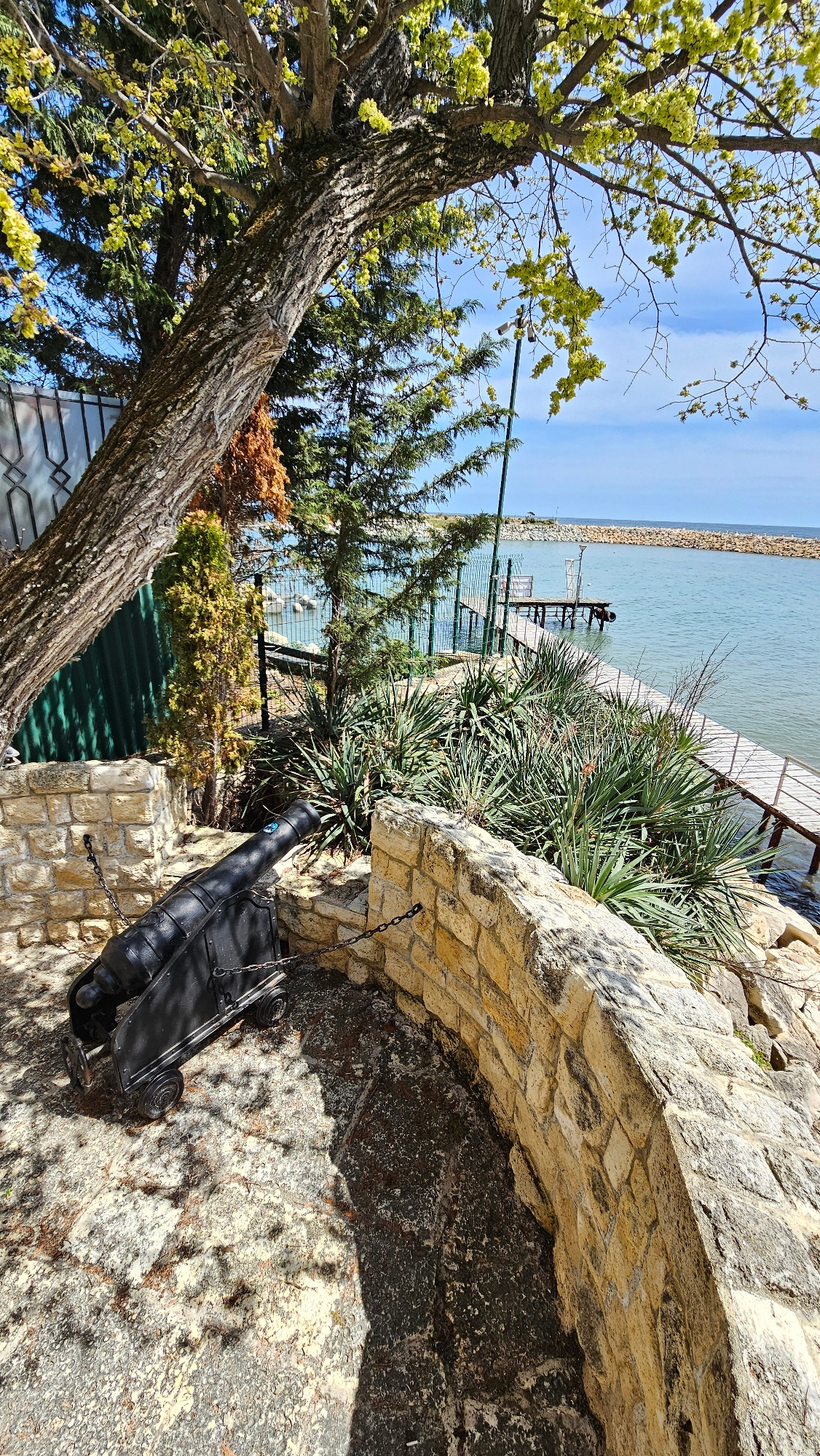 The image captures a bright, sunny outdoor scene, likely in Varna, Bulgaria, showcasing a coastal or lakeside landscape. In the foreground on the left, a large tree with a thick, textured trunk and vi…read more
