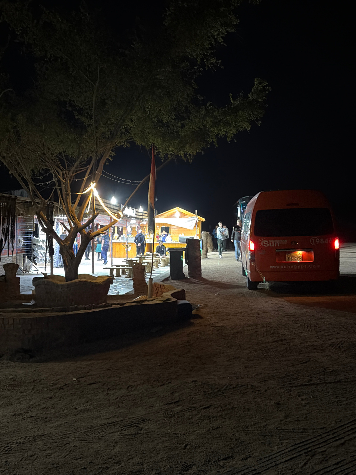 At night in a Village, Egypt setting, an orange shuttle van is parked with its rear facing the viewer. Two individuals stand near the van. An outdoor illuminated eating area with tables, chairs, and p…read more