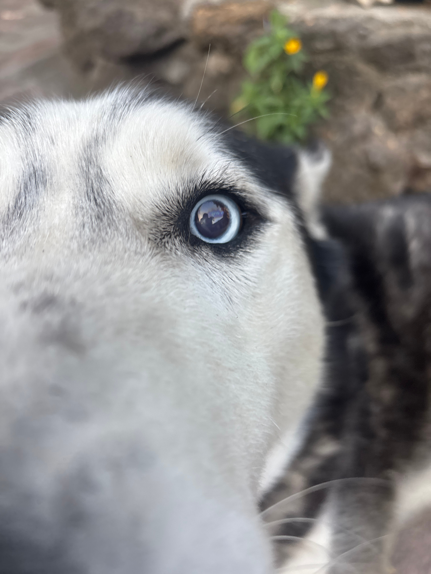 A close-up, low-angle photograph shows the face of a Husky-type dog. The dog has white and gray fur with one visible light blue eye reflecting what seems to be the photographer/phone and sky. In the b…read more