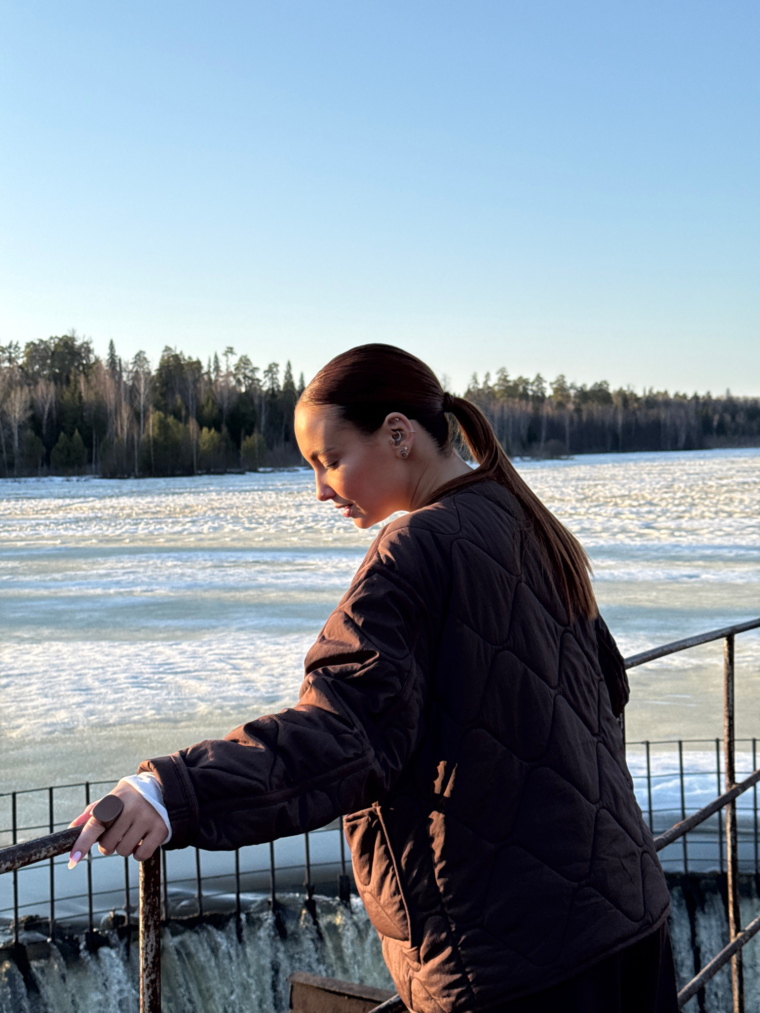 A woman with long, dark hair pulled back in a ponytail stands on what appears to be a bridge or elevated platform with metal railings. She is wearing a dark, quilted jacket and a white shirt. Her face…read more