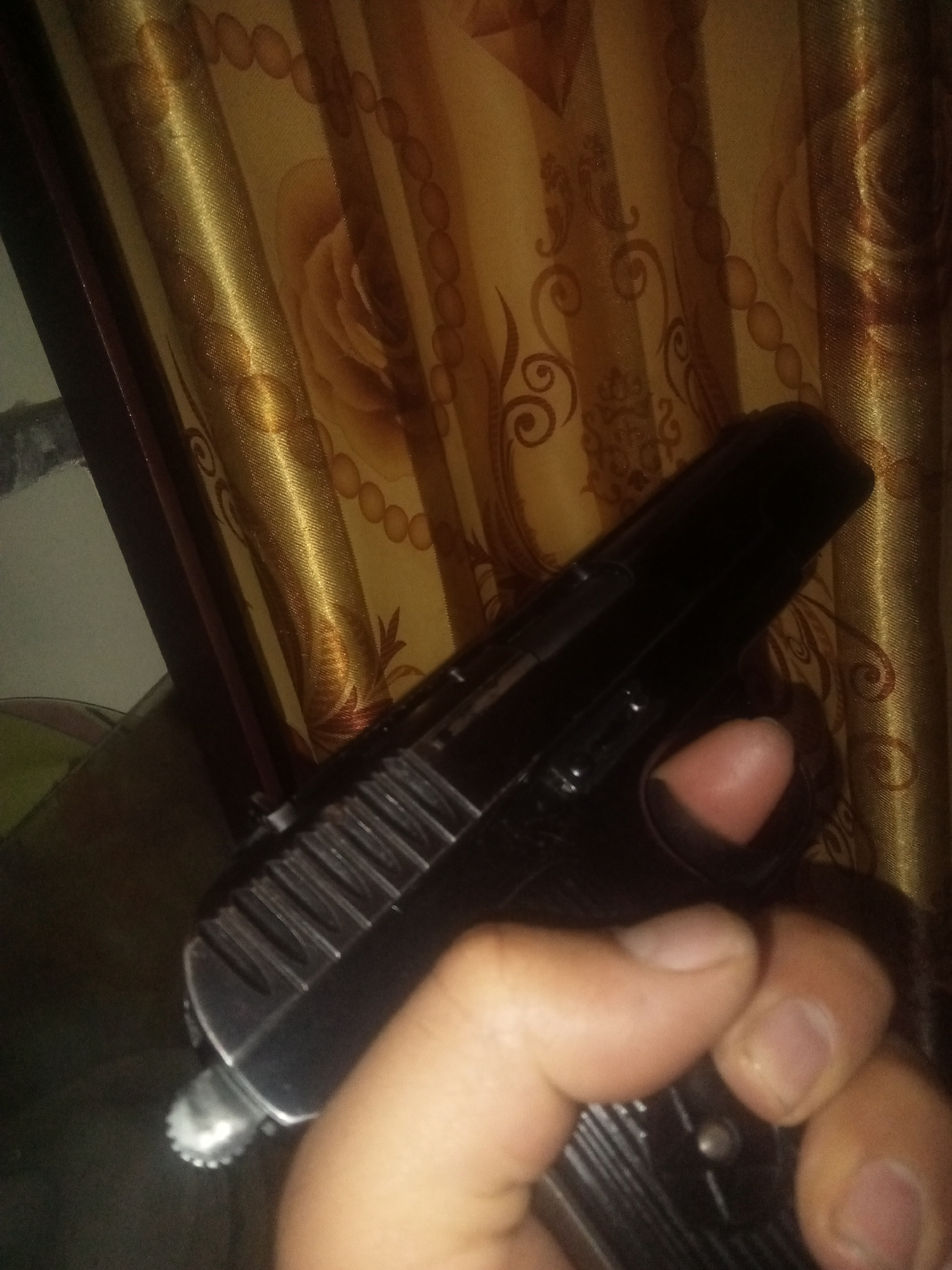 The scene is located in Mansehra, Pakistan. An indoor, close-up image shows a person's right hand holding a black semi-automatic pistol. The hand, with a light-to-medium skin tone, firmly grips the pi…read more