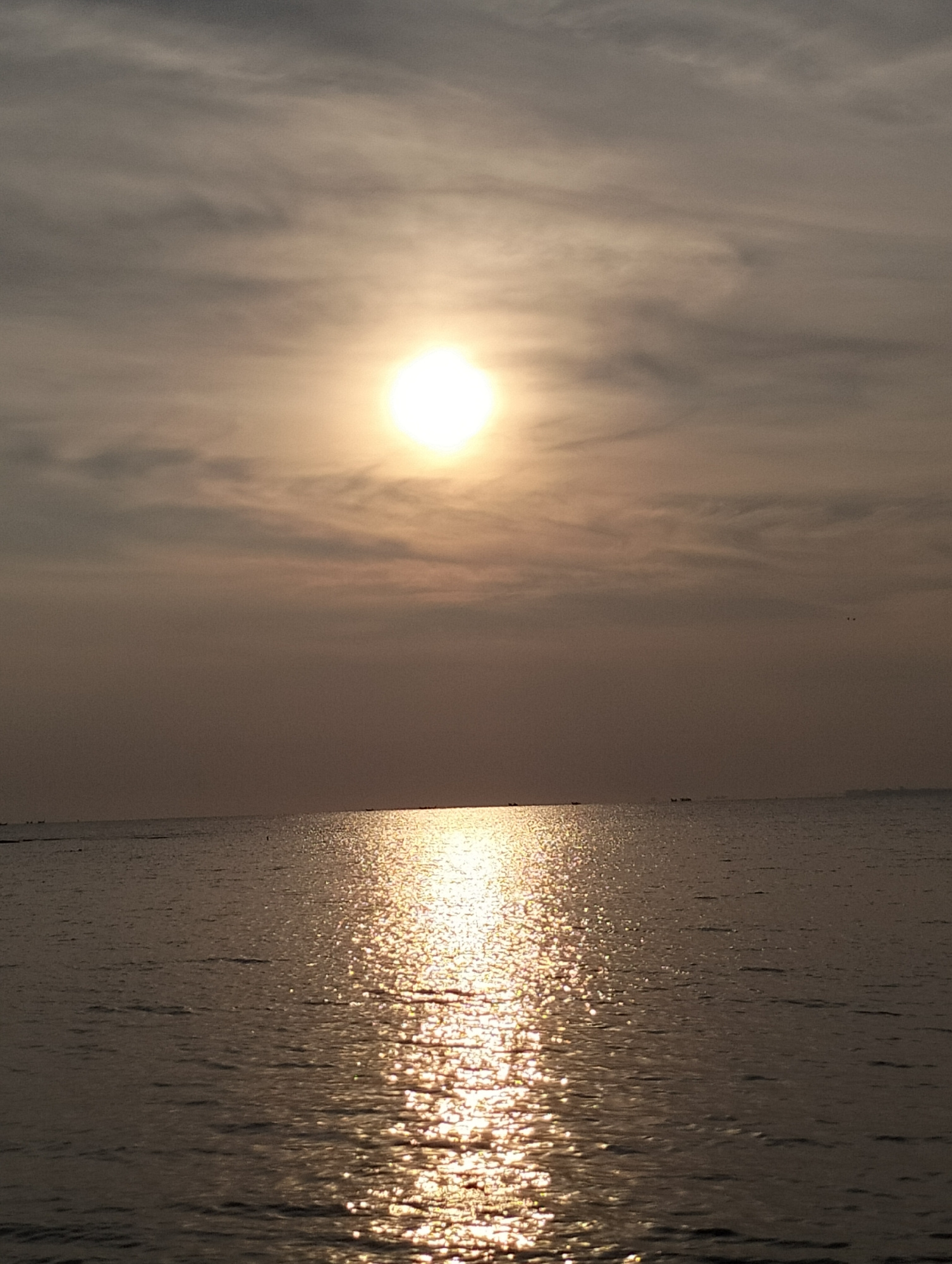 The image shows a sunset scene over the ocean. The sun is centrally positioned in the upper half of the frame, partially obscured by a layer of clouds. The light from the sun reflects off the water, c…read more
