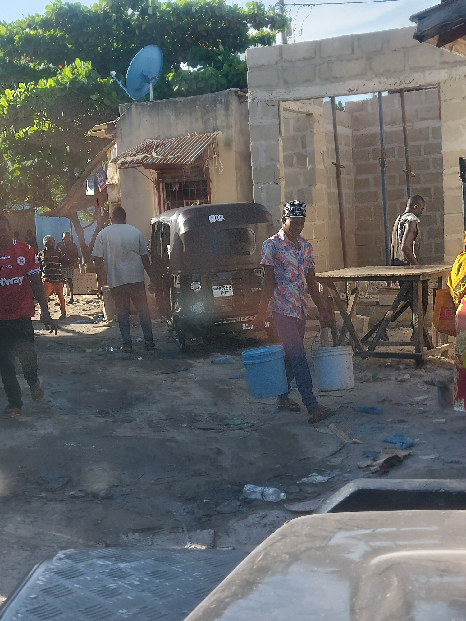 In Dar es-Salaam, Tanzania, a bustling street scene unfolds. A man wearing a patterned shirt and traditional cap carries a blue bucket, possibly filled with water, and interacts with a tuk-tuk style v…read more