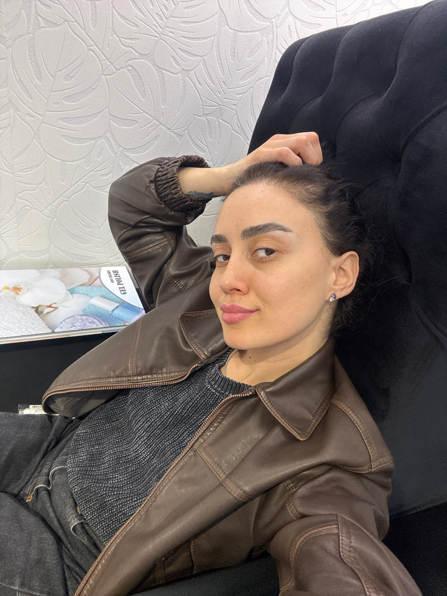 A woman wearing a brown leather jacket over a grey sweater and dark jeans is indoors, reclining against a black tufted sofa. She is resting her head on her hand. The wallpaper is white with a leafy pa…read more