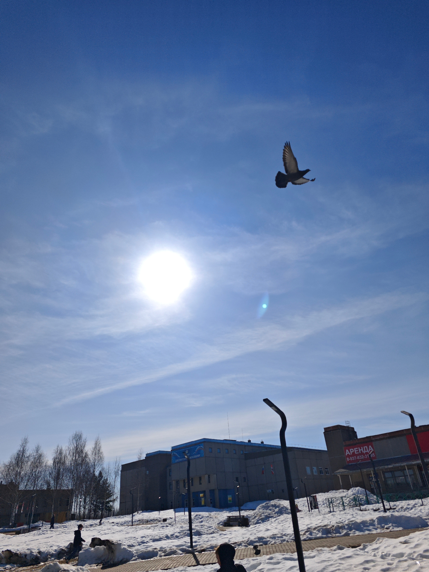 The image depicts a sunny day in Марковский, Russia, with a clear blue sky punctuated by wispy clouds and the bright sun. A pigeon is in flight against the sky. The ground is covered in snow, with pat…read more