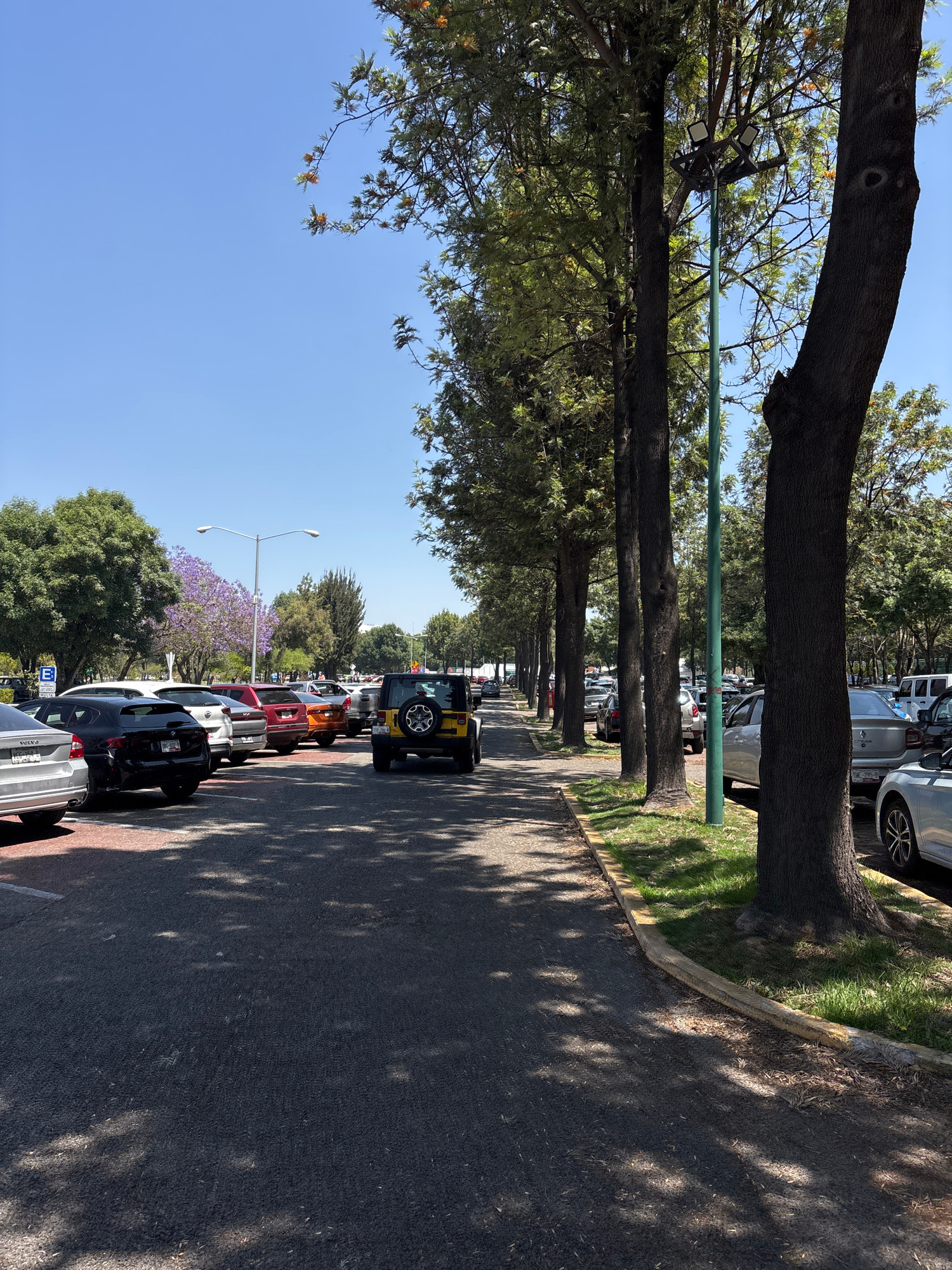 The image shows a tree-lined street in San Andrés Cholula, Mexico. Cars are parked on both sides of the street. A yellow Jeep is driving down the street. There is a sidewalk next to the street. Street…read more