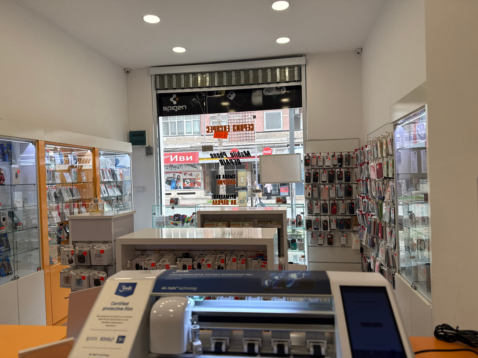 Here's a description of the scene: The image captures the interior of a mobile phone accessory store. The location is inferred to be in Burgas, Bulgaria, based on the Cyrillic script visible on storeβ¦read more