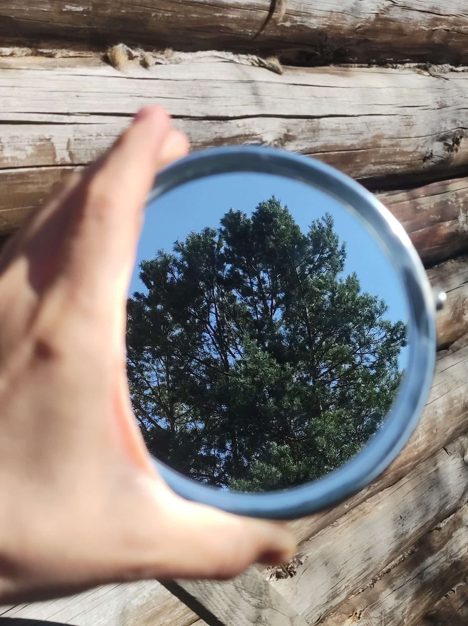A close-up shot captures a human hand holding a small, round mirror, reflecting a natural outdoor scene against a rustic wooden background. The hand, slightly out of focus and positioned on the left,…read more