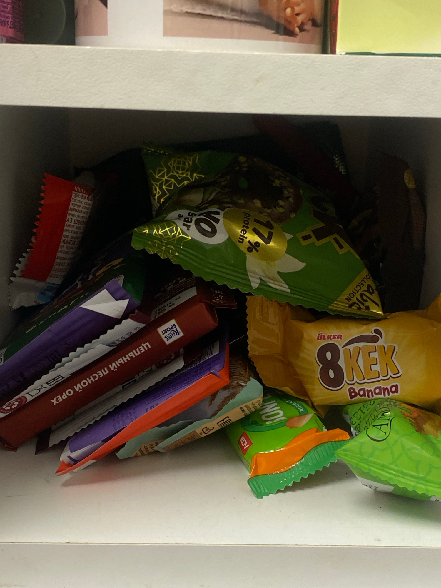 A cluttered view from above inside a white container/drawer filled with various wrapped sweets and snacks. Prominent items include a green "NO!sar" protein bar, a yellow "Ülker 8 Kek Banana" cake bar,…read more