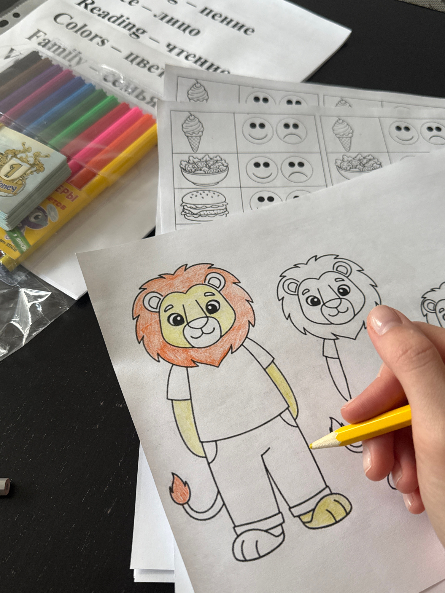 The image captures a tabletop scene centered around educational and creative activities. A hand with neatly manicured nails holds a yellow colored pencil, actively coloring a cartoon lion drawing on a…read more