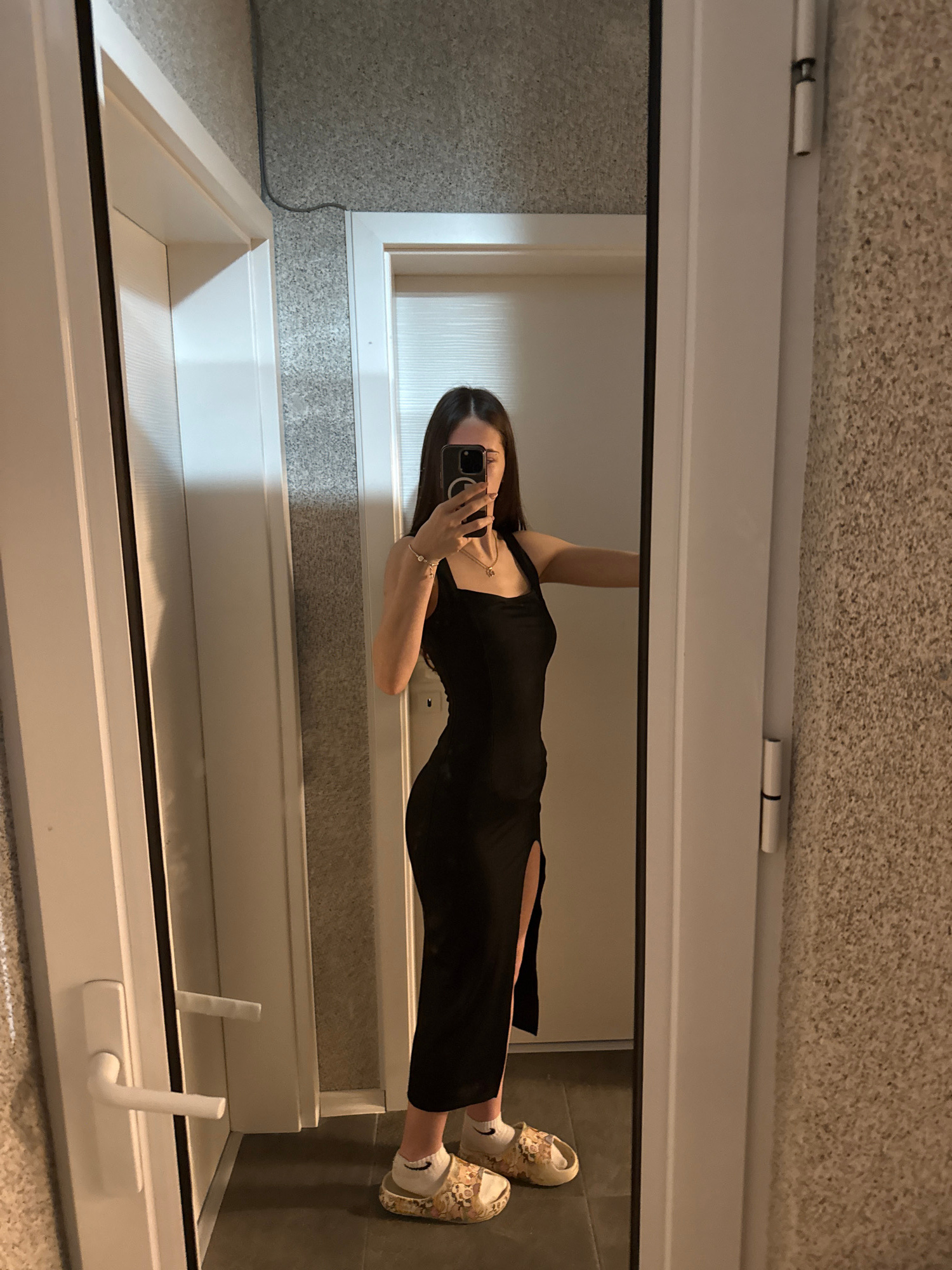 A woman is standing indoors, facing a mirror, and taking a selfie with her smartphone. She is wearing a black dress with a slit on the side and patterned clogs with white socks. The reflection shows a…read more