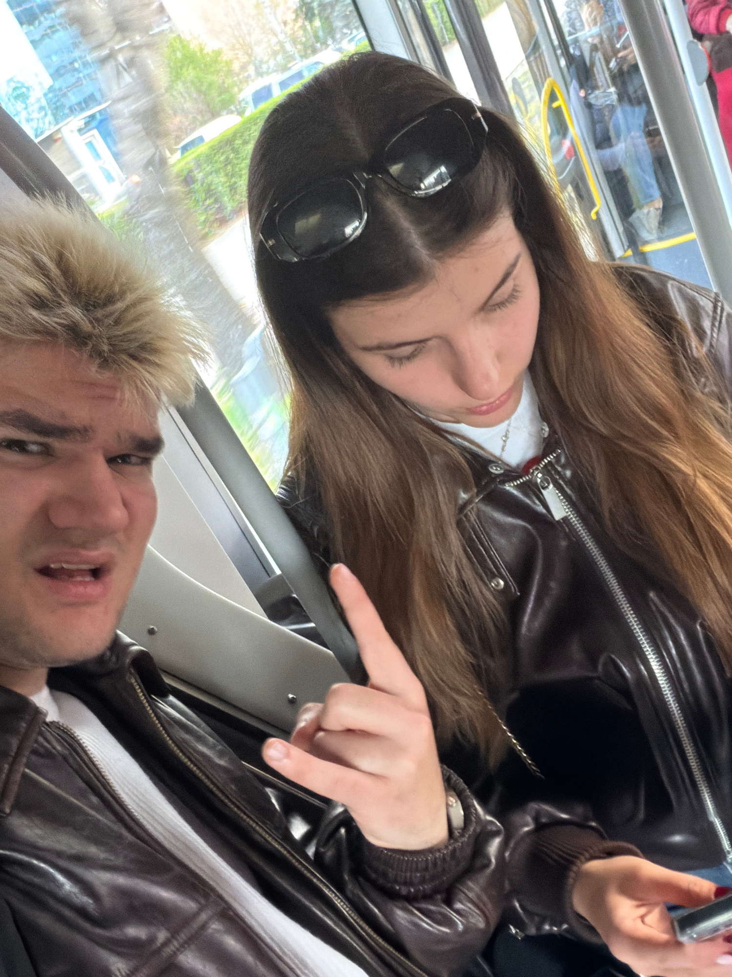 A young woman with long brown hair, wearing sunglasses and a brown leather jacket, is seated next to a young man with light blonde hair, also wearing a brown leather jacket. The woman's eyes are close…read more