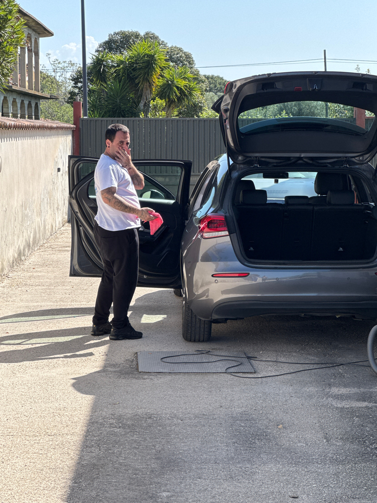 The image captures an outdoor scene featuring a man engaged in car cleaning or maintenance on a sunny day in what appears to be Aprilia, Italy. The main subject is a man with short dark hair and a be…read more