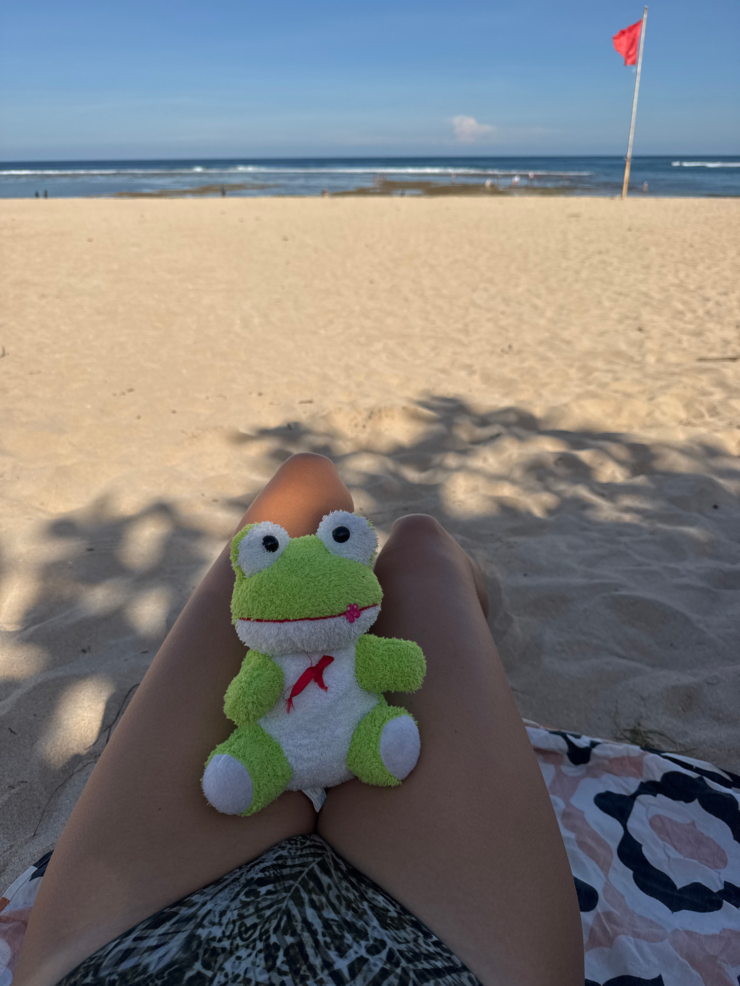 Image taken at a beach in Kuta Selatan, Indonesia. A red flag is visible on the beach. The scene shows a person wearing patterned clothing lounging on the sand with a stuffed frog toy on their lap. Th…read more