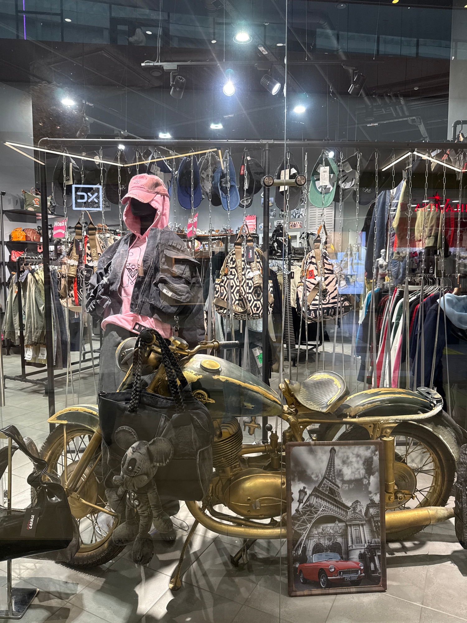 The image displays a retail store window or interior display, featuring various merchandise arranged around an antique-style motorcycle, all seen through a reflective glass partition. Overhead artific…read more