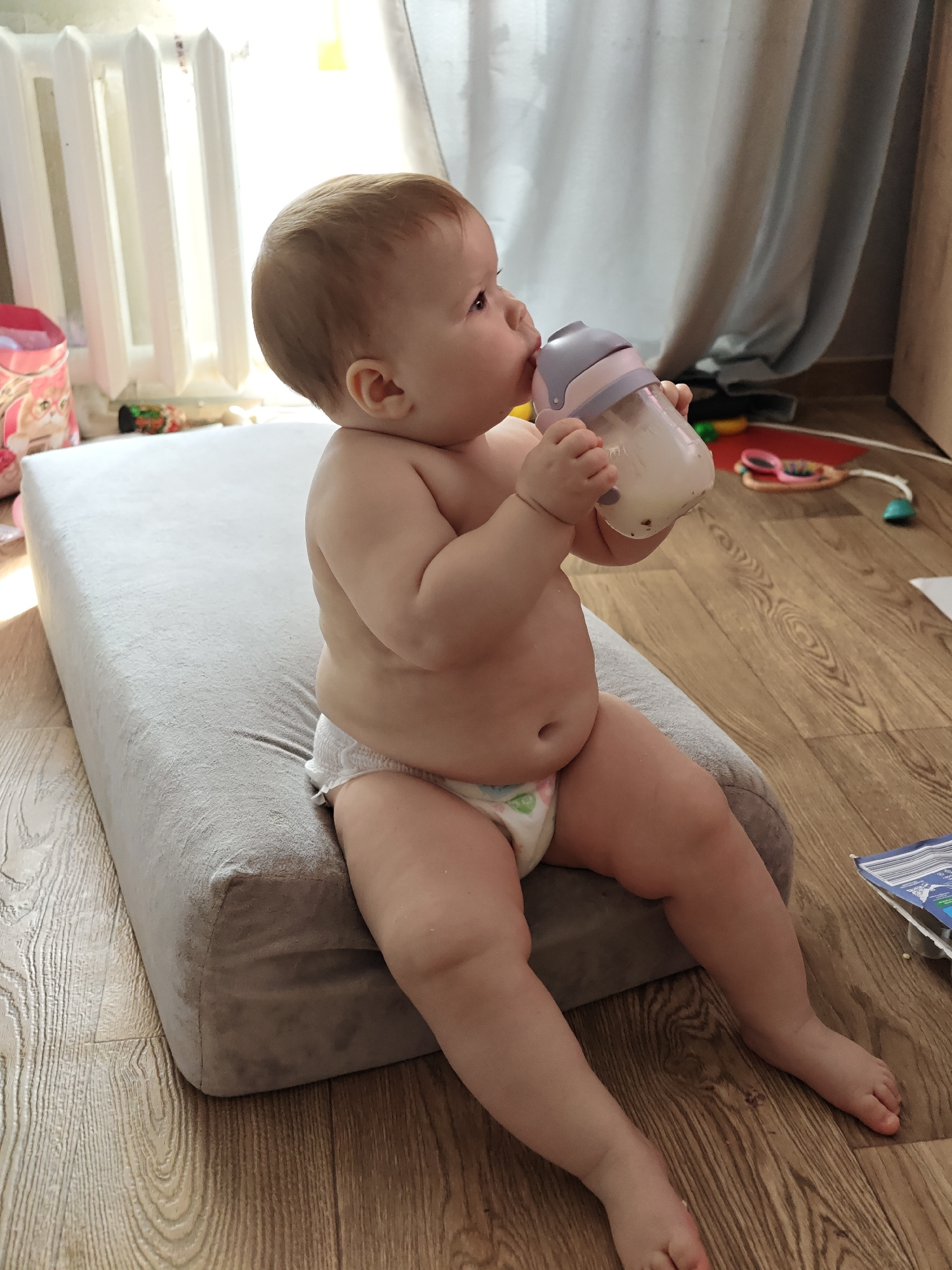 A baby is sitting on a grey cushion, drinking from a bottle. The baby is wearing a diaper. The location is Chaikovsky, Russia. The background includes a white radiator, a window with a curtain, and a…read more