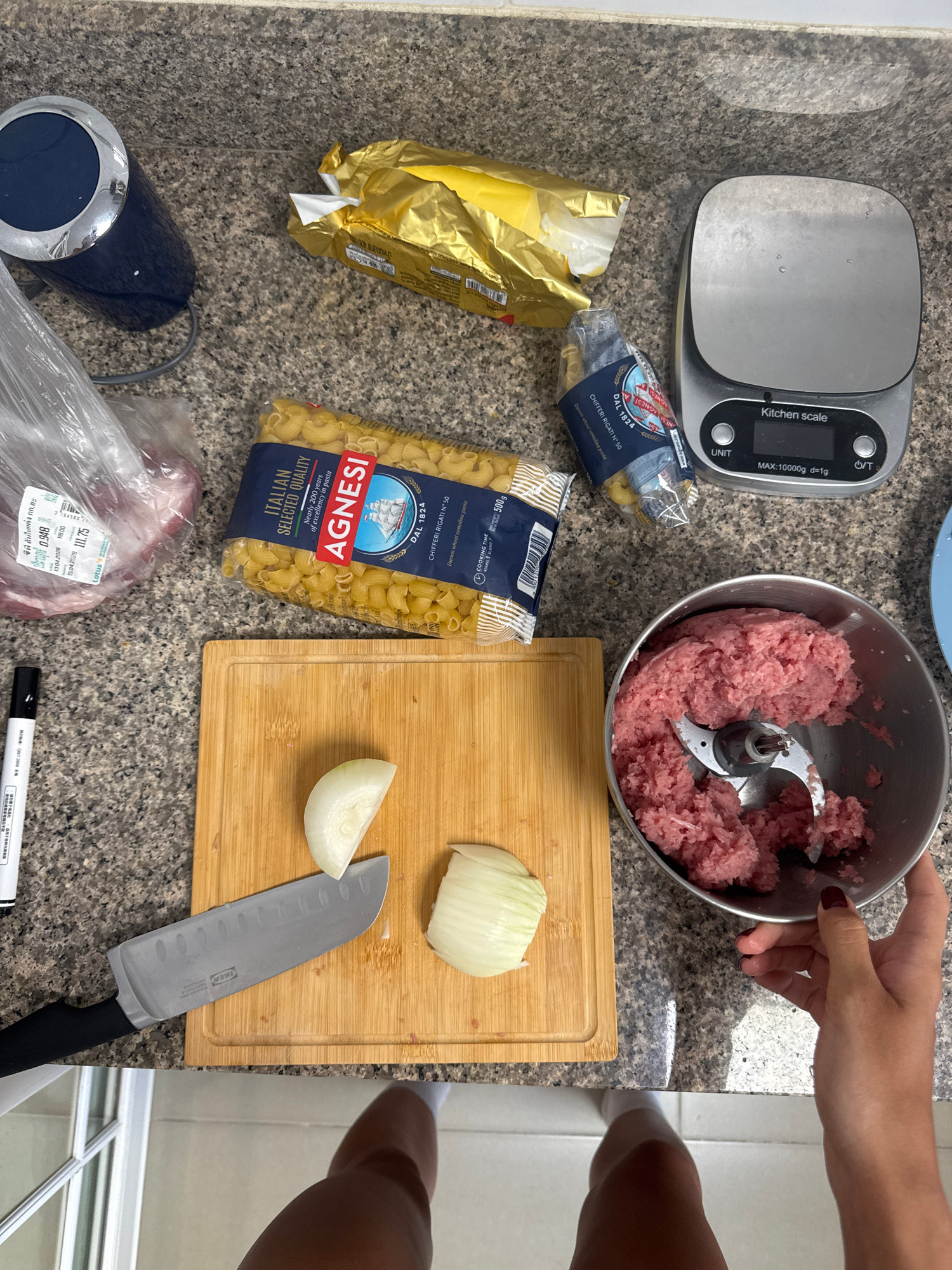 The image shows a kitchen counter with various food preparation items. A kitchen scale is on the upper left. Next to it are two opened packages of pasta, one gold and one blue, and the blue one is lab…read more