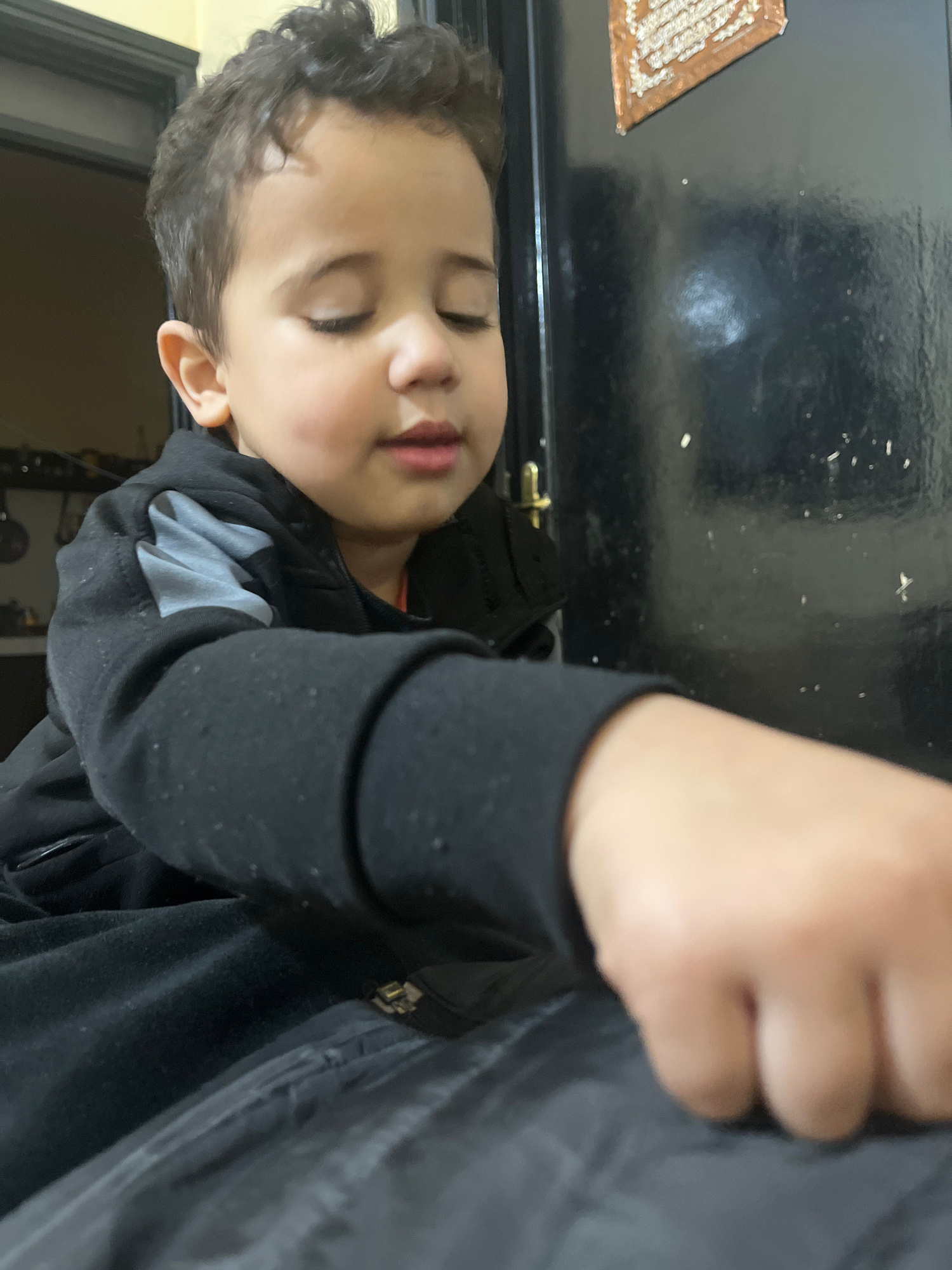 The image displays an indoor scene in Ouaouizert, Morocco, featuring a young child positioned prominently. The child, estimated to be between 2 and 5 years old, has dark, curly hair, light skin, close…read more