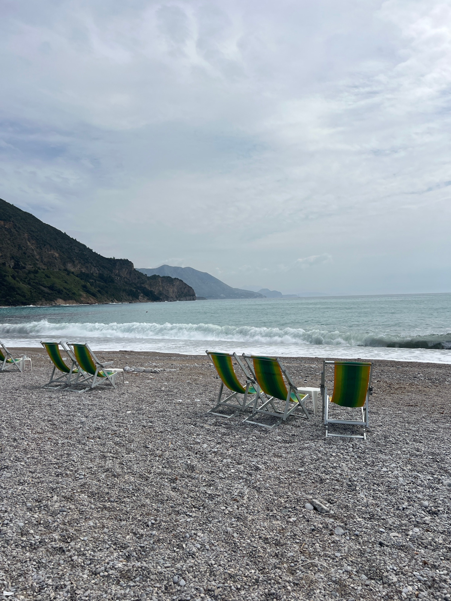 The image shows a beach scene in Prijevor, Montenegro, featuring a row of unoccupied beach chairs with green and yellow striped fabric on a pebble beach. The sea is rough with white waves crashing ont…read more