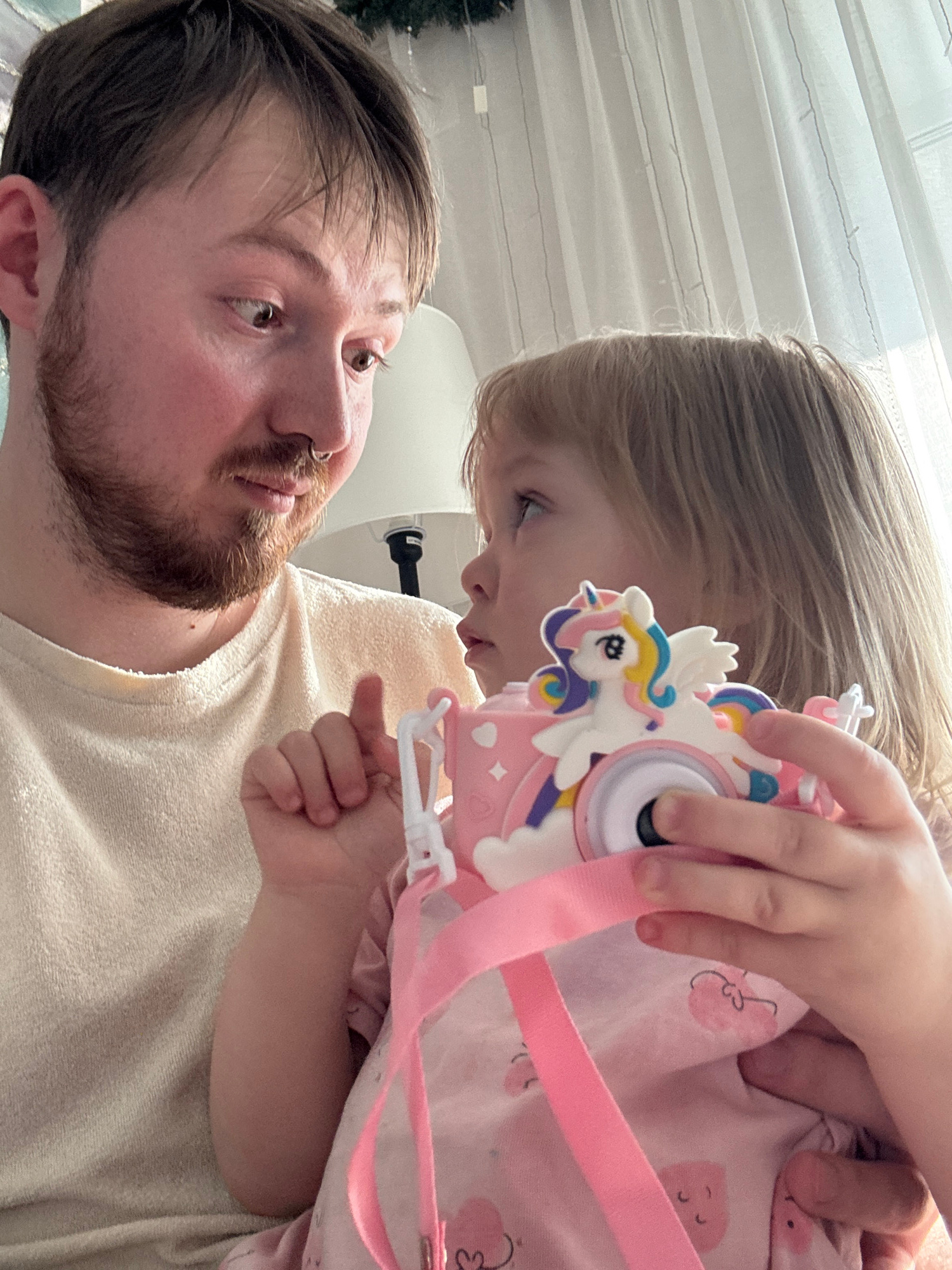 An indoor, eye-level shot captures a tender interaction between an adult man and a young child. The man, with a neatly trimmed beard, dark hair, and a septum piercing, is positioned in the lower left…read more