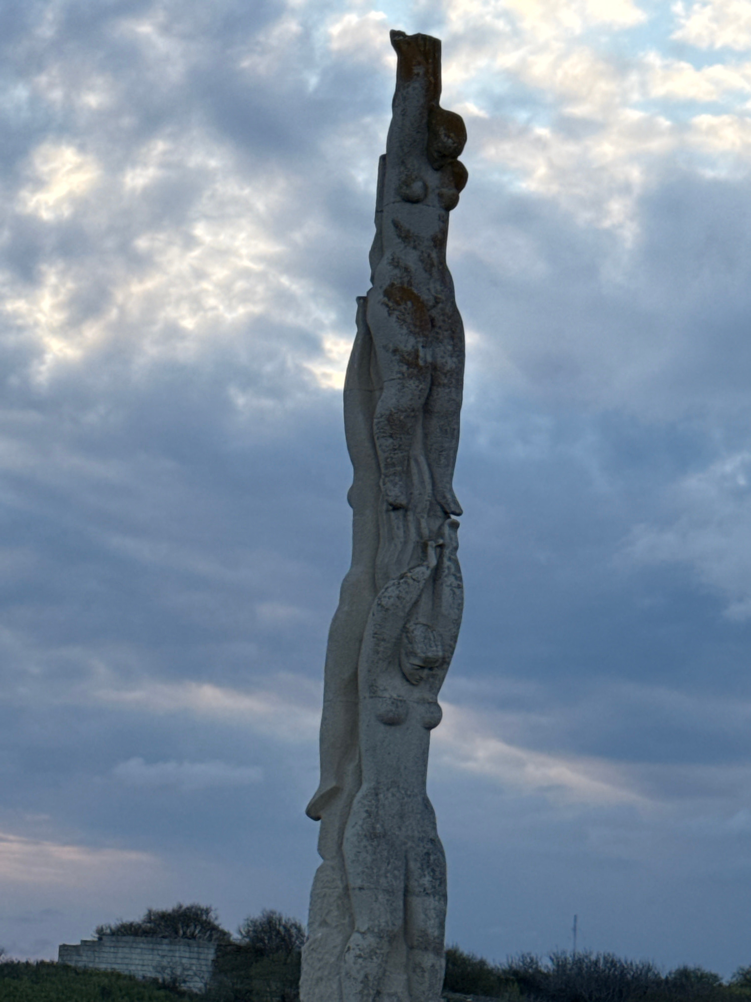 The image shows a weathered concrete monument in Balgarevo, Bulgaria, set against a cloudy sky. The monument's horizontal, elongated design features stylized shapes suggestive of entwined figures or a…read more