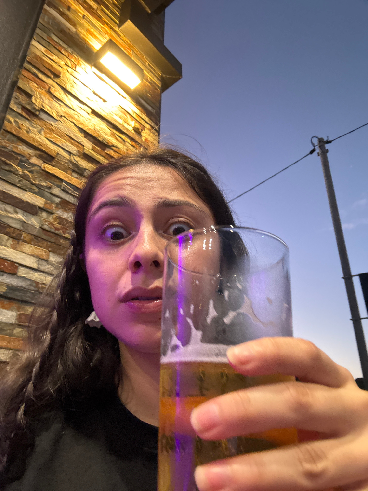 A tilted, low-angle photograph depicts a woman holding a pint glass of beer in front of her face. The background shows a building with a textured stone facade illuminated by an external light, a utili…read more