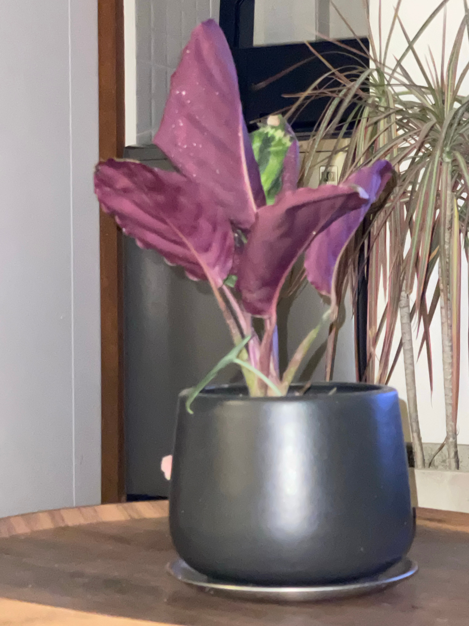 This image, presented sideways, depicts an indoor scene focused on two potted plants. In the foreground, a plant with large, dark purple, somewhat droopy leaves, possibly a Calathea 'Dottie', occupies…read more