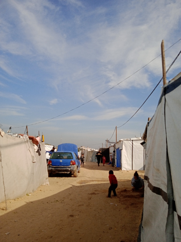 The image depicts a dirt pathway through a dense, informal settlement in Khan Yunis, Palestinian Territory, under a bright blue sky with scattered cirrus clouds. The pathway, composed of light brown,…read more