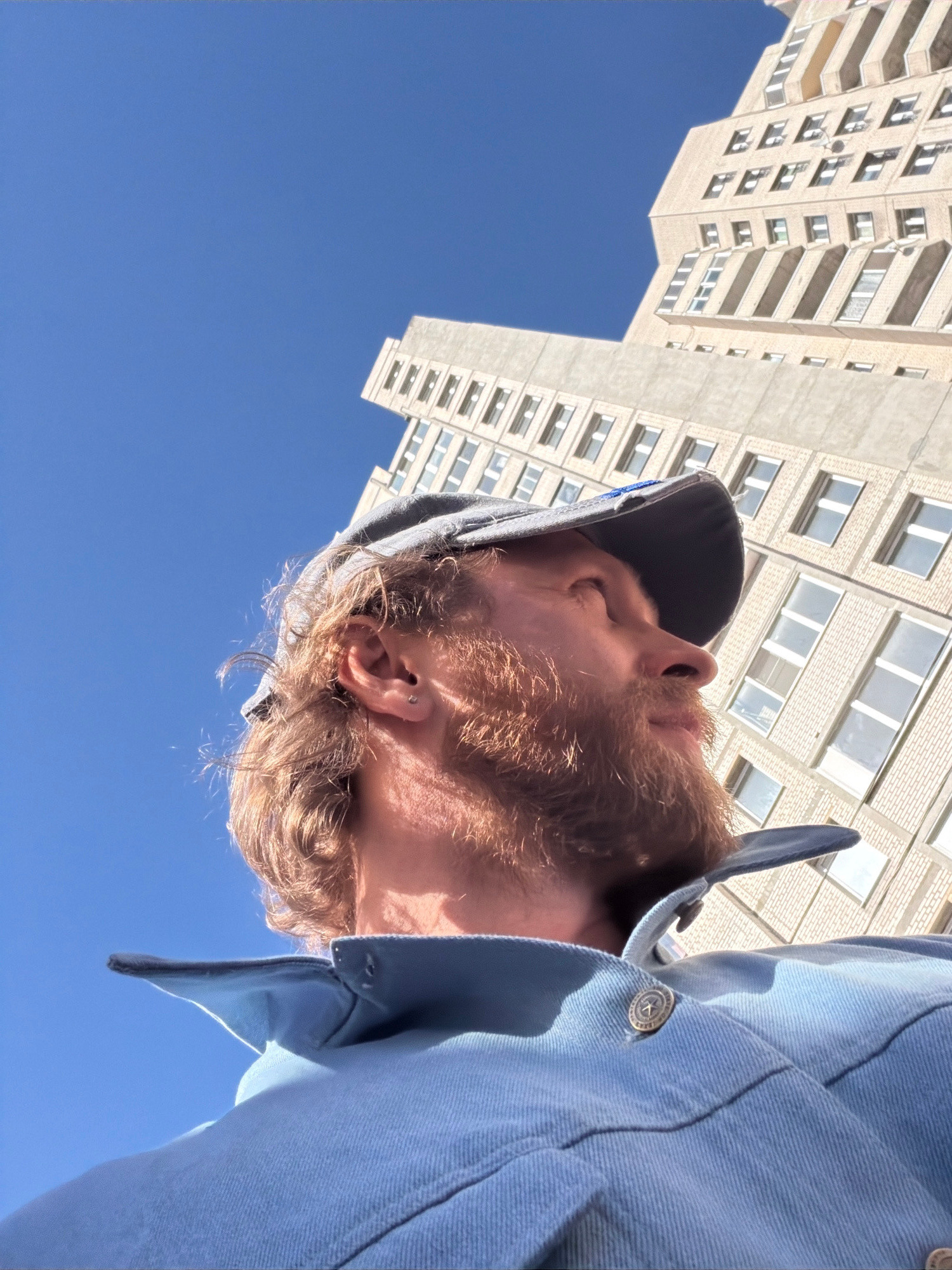 The media file presents an upward-facing, rotated close-up shot of a man's head and shoulder against a bright blue sky and a tall building. The subject is a man with a prominent reddish-brown beard an…read more