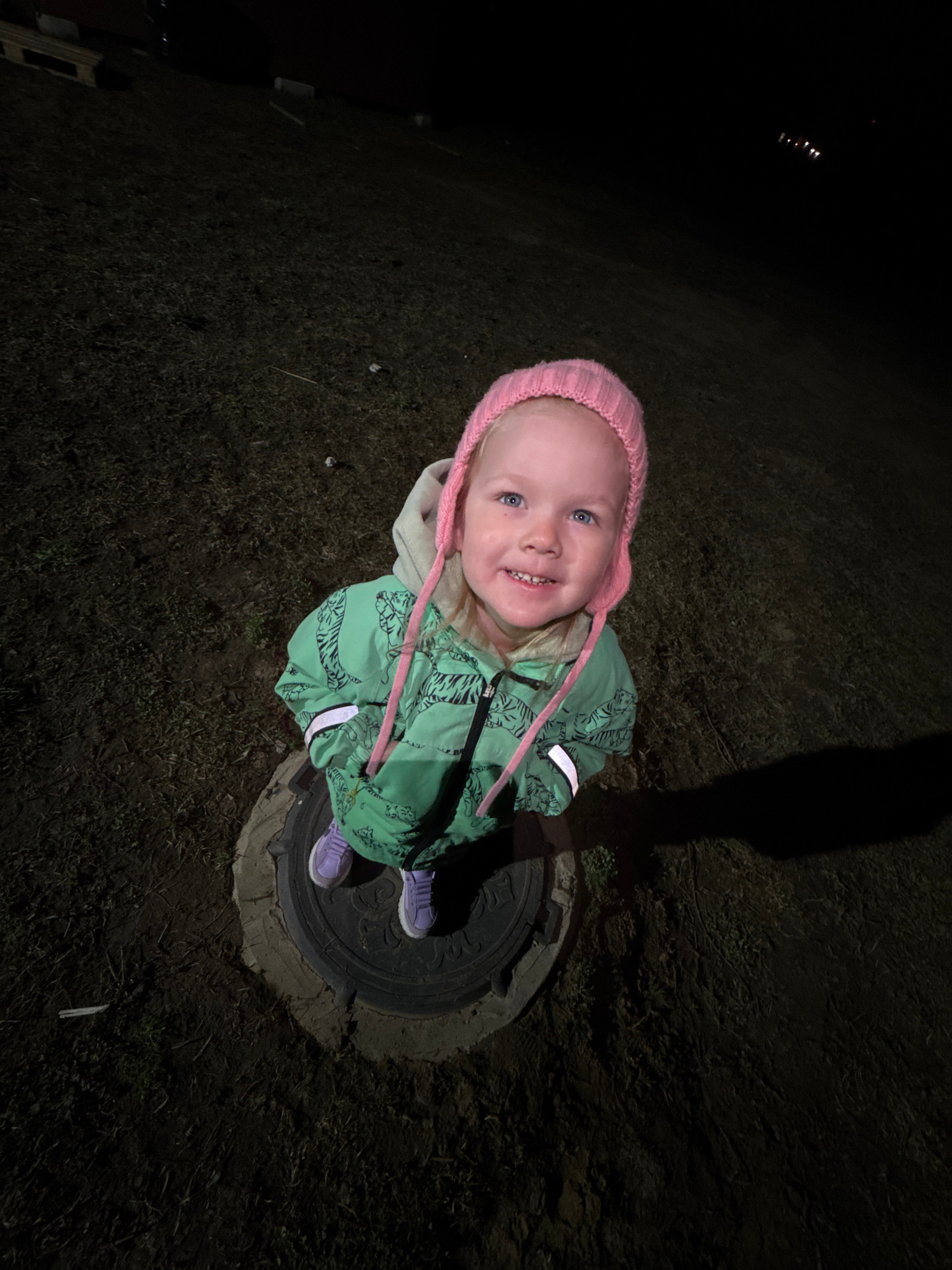 A young child stands on a manhole cover in Gornyi (Dvurechenskoe S/P), Russia. The child wears a pink knit hat and a green jacket with a tiger pattern. The child's shoes are purple. The surrounding en…read more