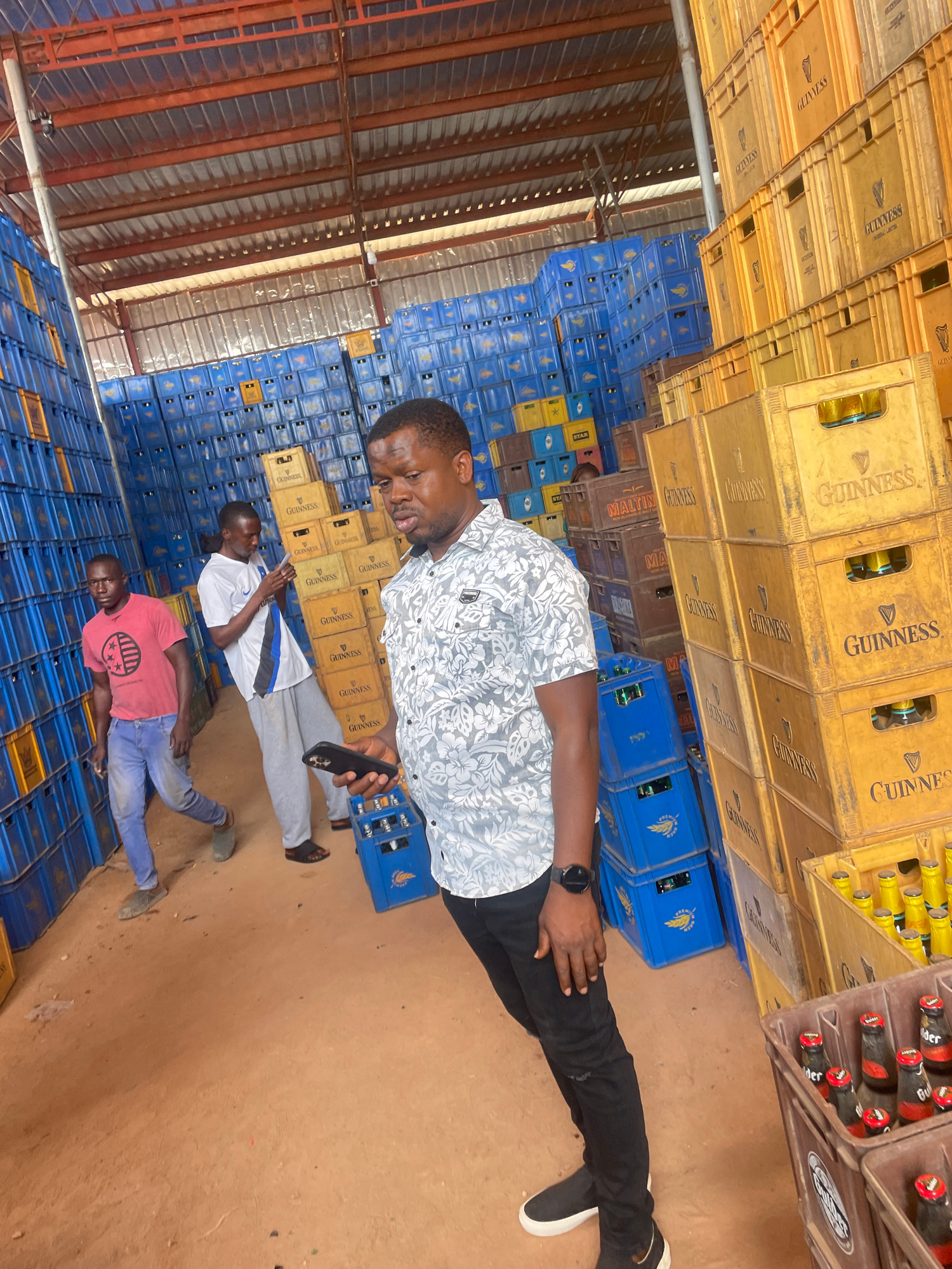Three men are standing in what appears to be a large storage facility in Gura Top, Nigeria. The facility has a metal roof, and the floor is dirt. Stacks of blue and yellow plastic crates, many labeled…read more