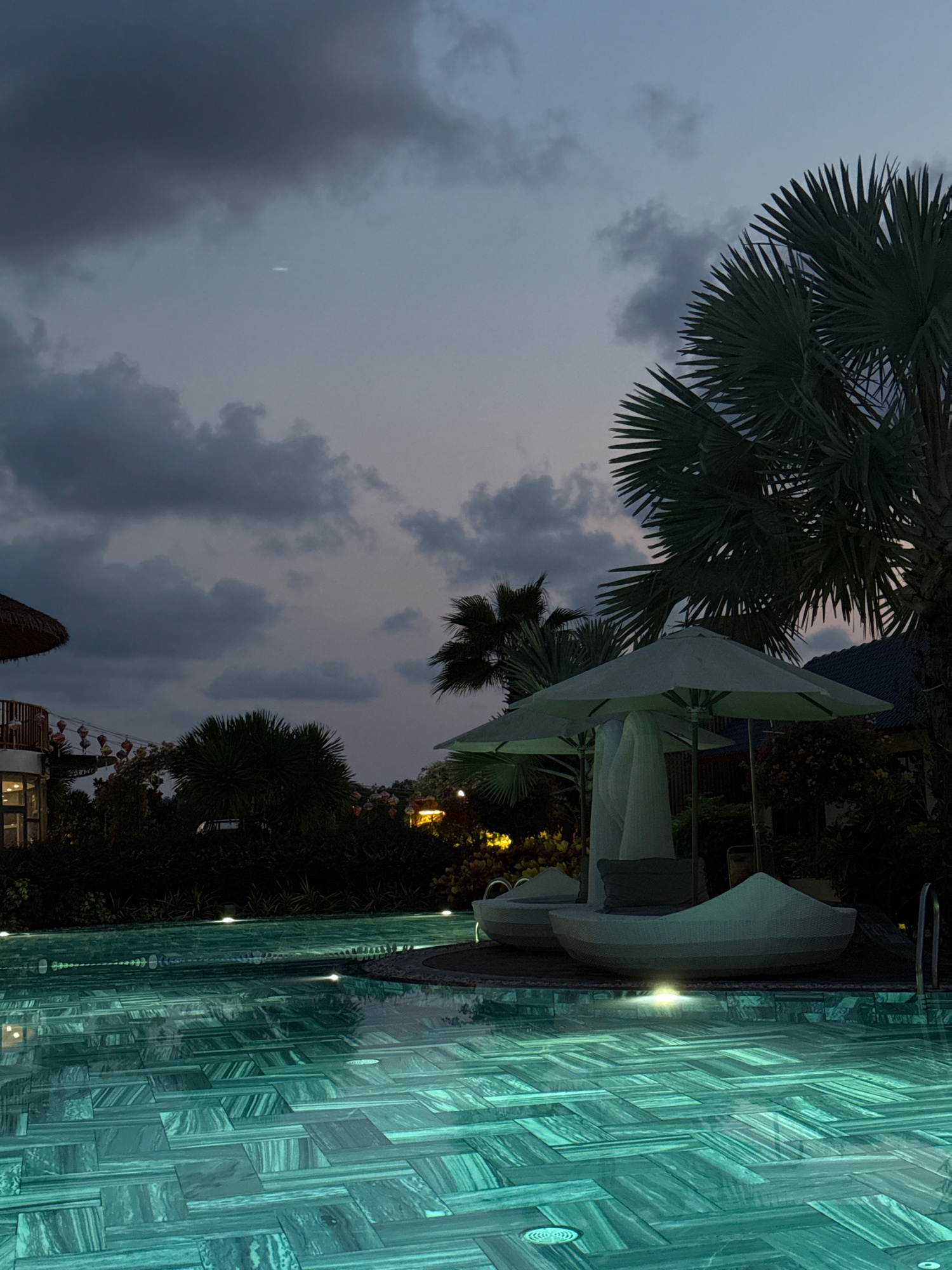 The image captures an outdoor evening or nighttime scene at a resort in Phú Quốc, Vietnam, featuring a swimming pool, lounge furniture, and tropical vegetation under a cloudy sky. In the foreground,…read more