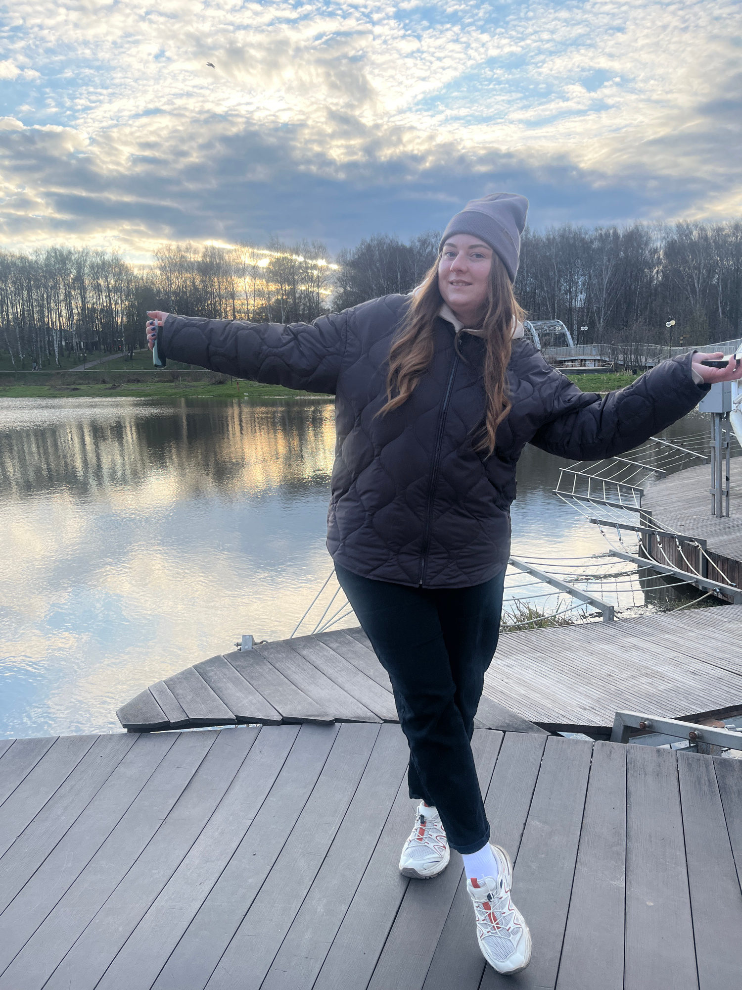 A woman stands on a wooden platform in Klin, Russia, on the Sestra River. She is wearing a grey beanie, a quilted jacket, black pants, white socks, and white sneakers. Her arms are extended. A phone i…read more