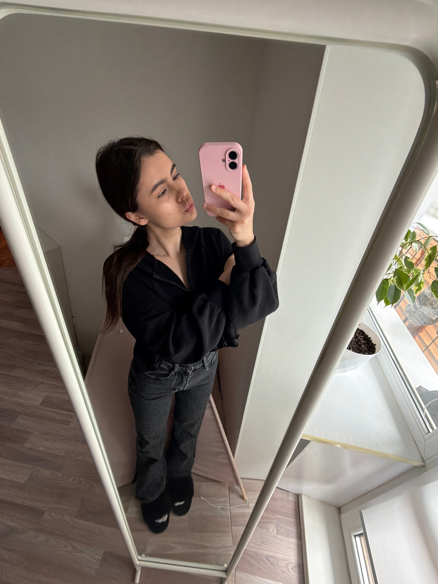 This image, taken in Chaikovsky, Russia, presents a mirror selfie of a person indoors. The individual, appearing to be a young woman, is reflected in a large, white-framed mirror, holding a pink smart…read more