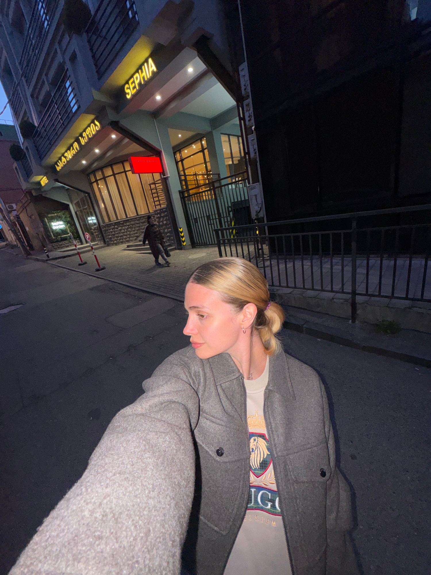 A person is taking a selfie on a street in Tbilisi, Georgia, at night. The person has blonde hair pulled back in a bun, and is wearing a gray coat over a light-colored top. The background includes a sā¦read more