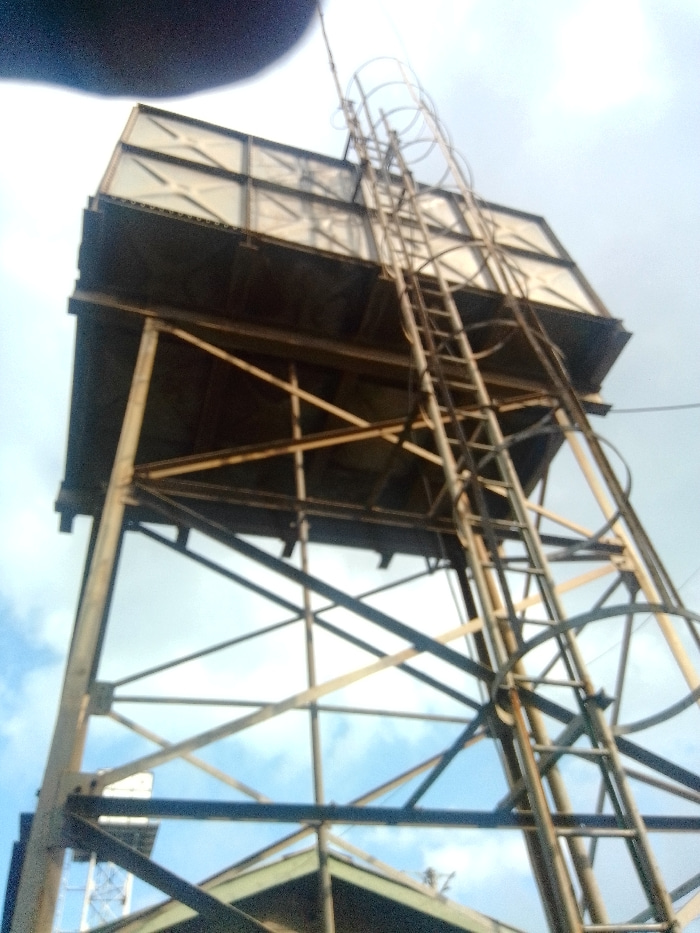 An elevated, square metal water tank is depicted, supported by a weathered metal structural framework. A vertical ladder, equipped with a safety cage consisting of circular metal hoops, extends from t…read more