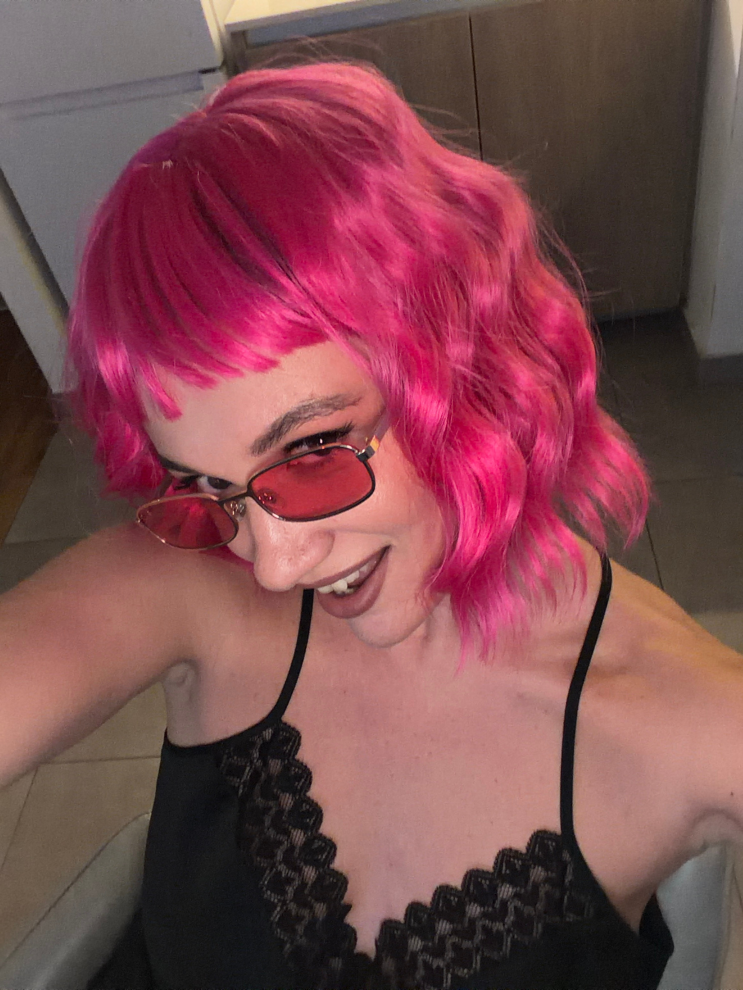 A woman with short, bright pink hair and red sunglasses is captured from a slightly angled, close-up perspective. She is wearing a black top with lace detailing along the neckline. The background is i…read more