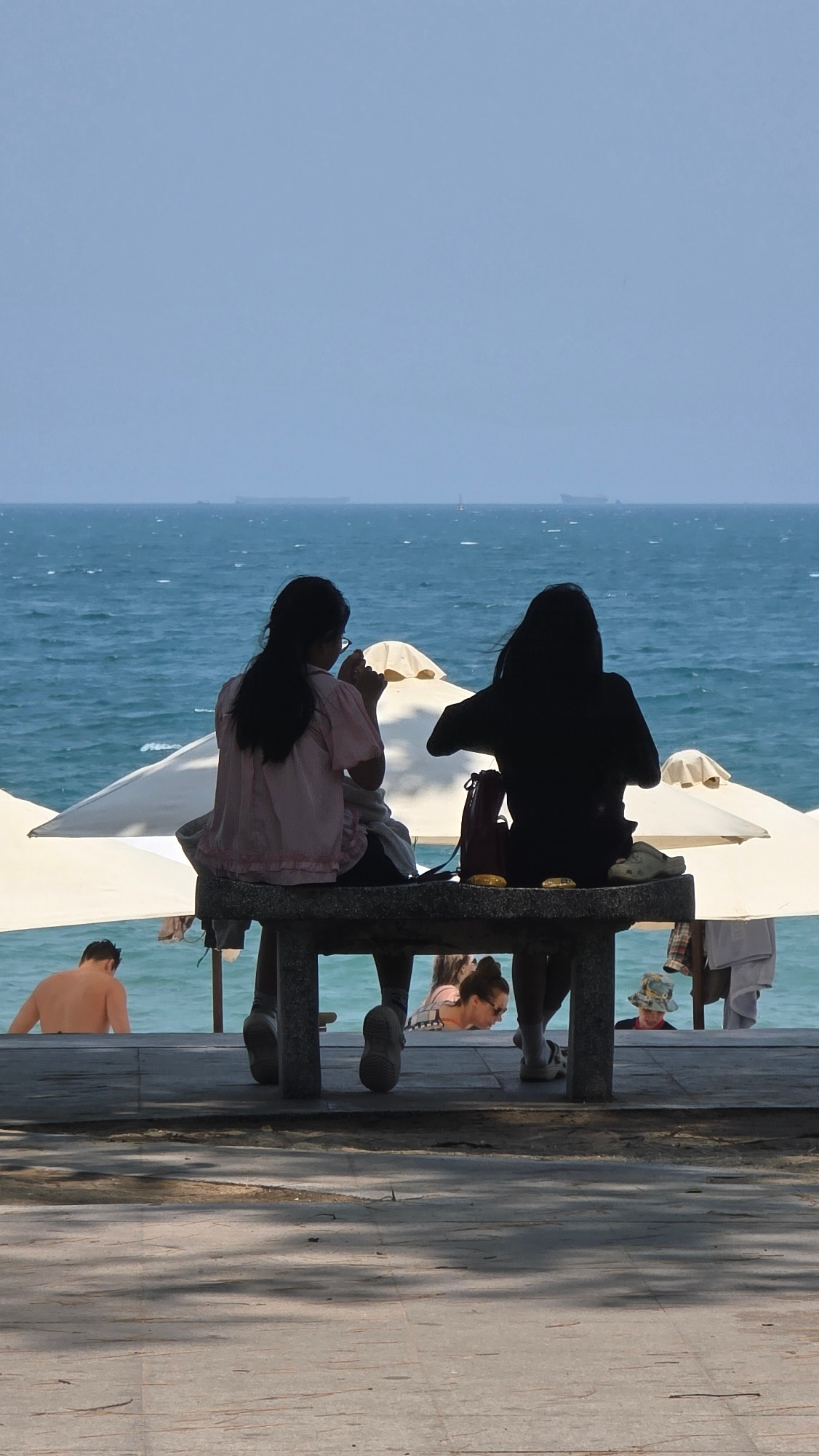 Two people are sitting on a bench by the sea in Nha Trang, Vietnam. One person is wearing a pink top and the other is wearing a black jacket. The sky is blue and the sea is turquoise. There are other…read more