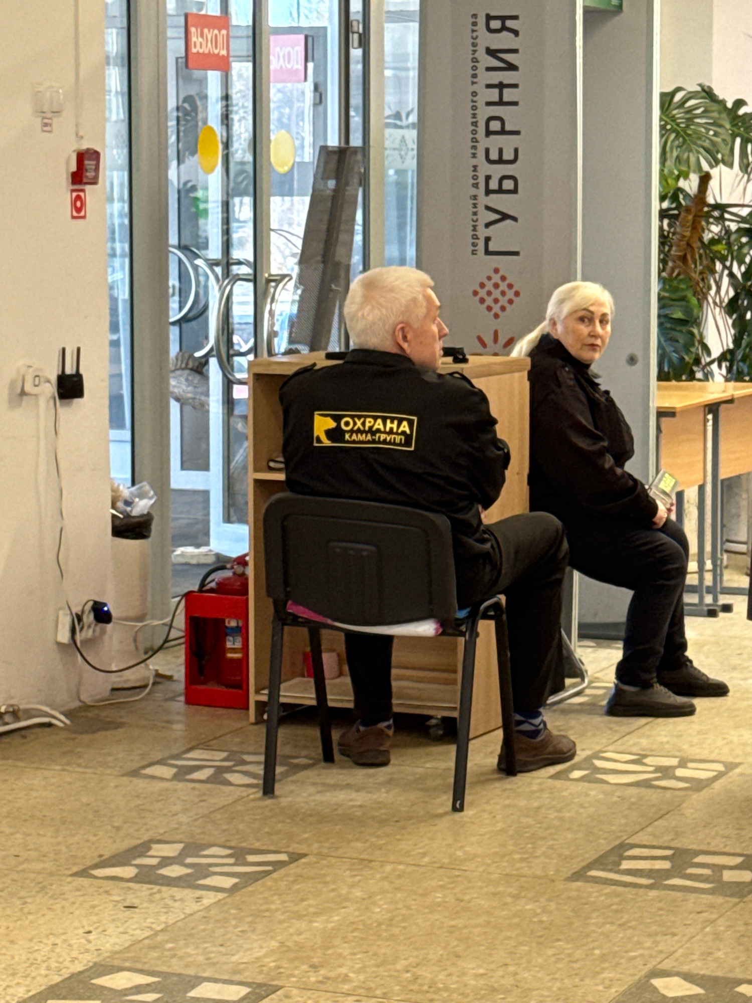 Two elderly individuals are seated in an indoor location in Perm, Russia. A fair-skinned woman with platinum blonde hair is sitting on a ledge, facing the camera. She is wearing black clothing and bla…read more