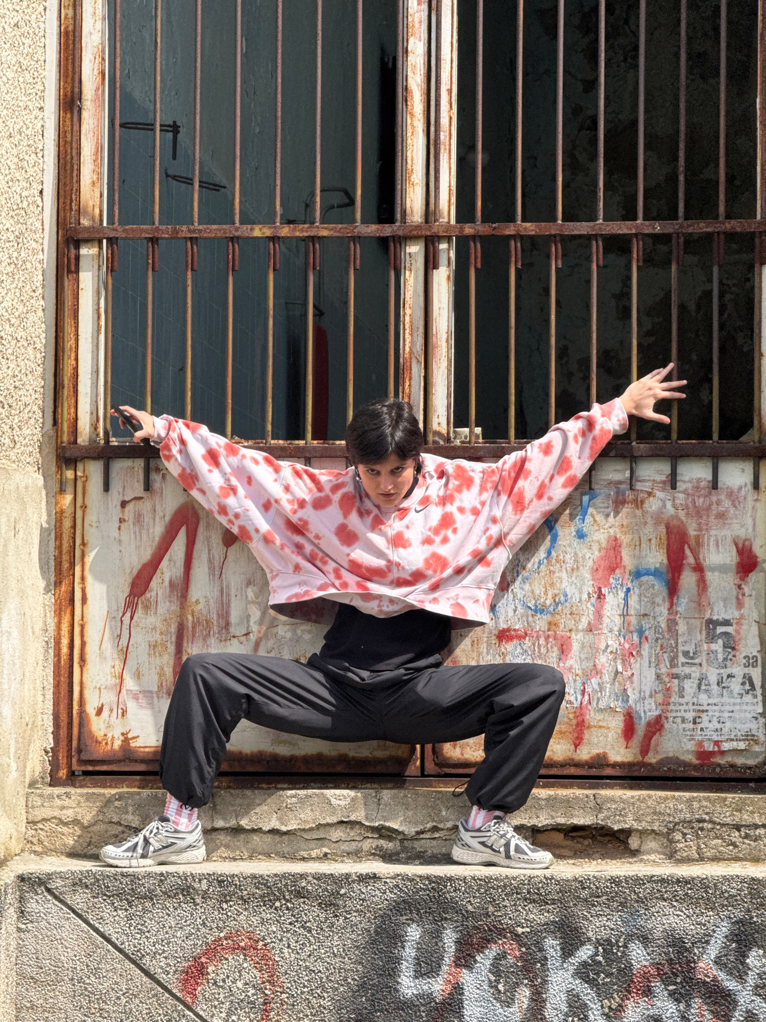 A person wearing a pink and white tie-dye hooded sweatshirt, black pants, and sneakers is positioned sideways against a textured wall with graffiti. The person is holding a black object in their leftβ¦read more