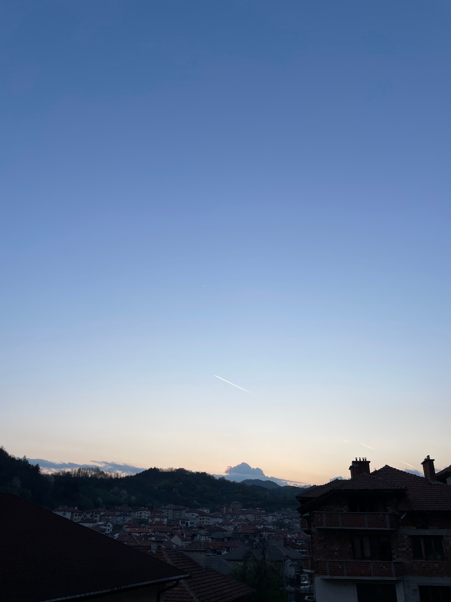 The image depicts a view of Zlatograd, Bulgaria at dusk. A clear blue sky transitions to a lighter hue near the horizon, with contrails visible from aircraft. The foreground contains buildings with re…read more