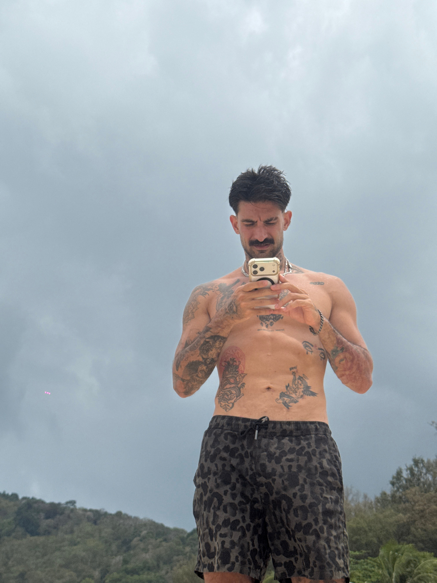 A man with multiple tattoos on his torso, arms, and hands is taking a selfie with a phone on what appears to be a beach in Rawai, Thailand. He is wearing patterned shorts and a silver chain necklace.…read more