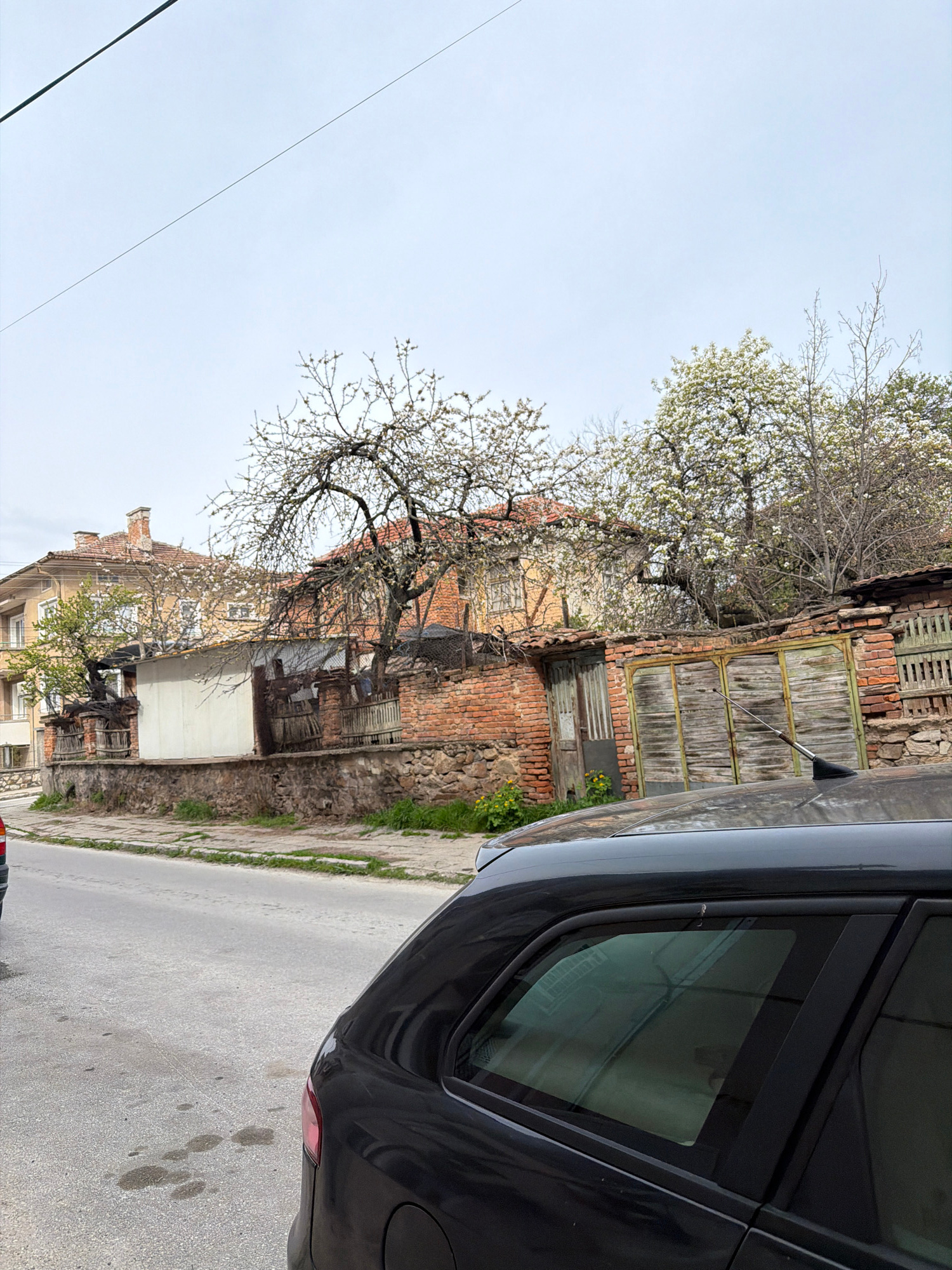 The scene depicts an urban landscape in Panagyurishte, Bulgaria. A black vehicle occupies the right side of the frame, partially obscuring the view. To the left, an old brick building stands adjacent…read more