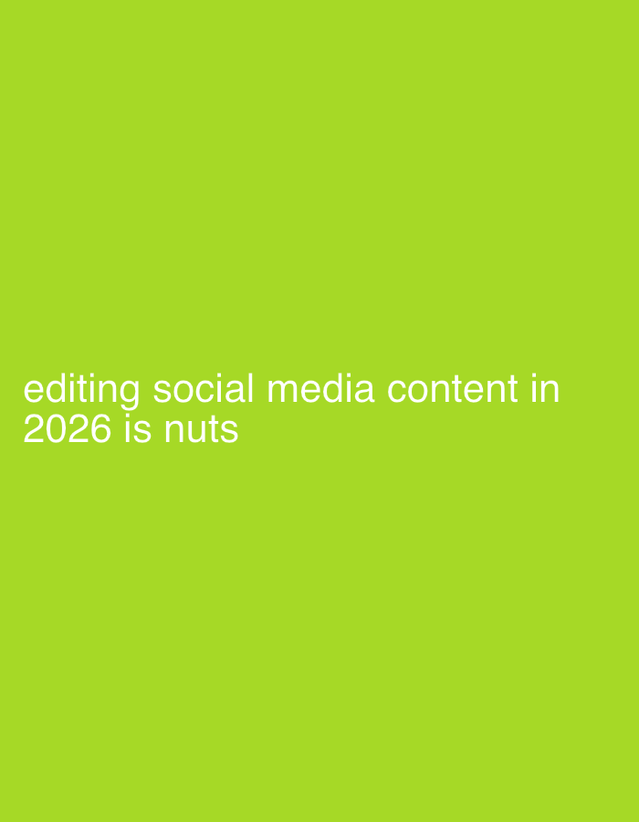 The image displays a solid lime green background. White, sans-serif text is centrally aligned horizontally in the lower portion of the frame, reading: "editing social media content in 2026 is nuts". N…read more