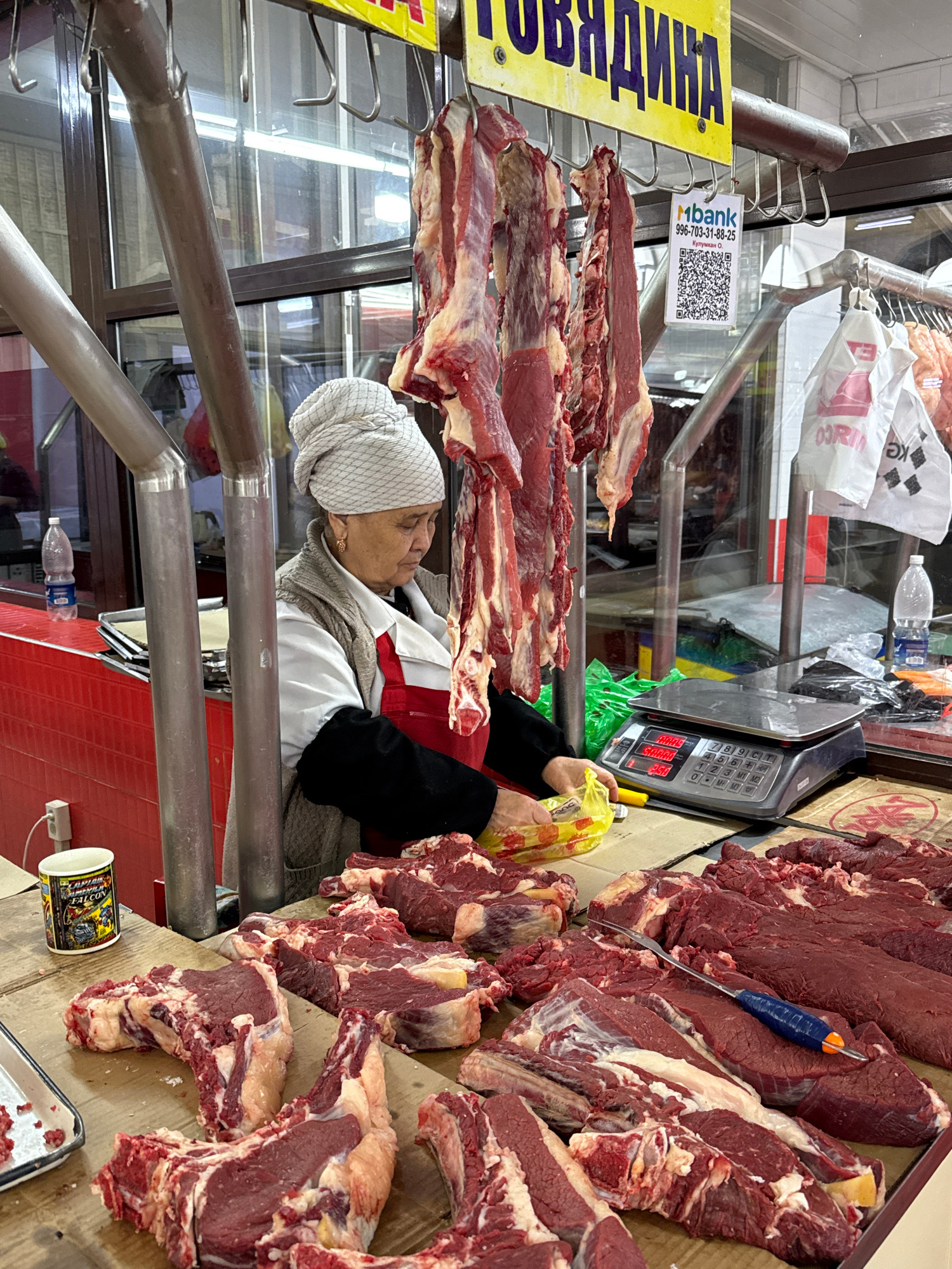 This image depicts a bustling meat stall or butcher shop in Bishkek City, Kyrgyzstan, likely during daylight hours. The central subject is a woman, presumably a butcher or vendor, captured from the wa…read more