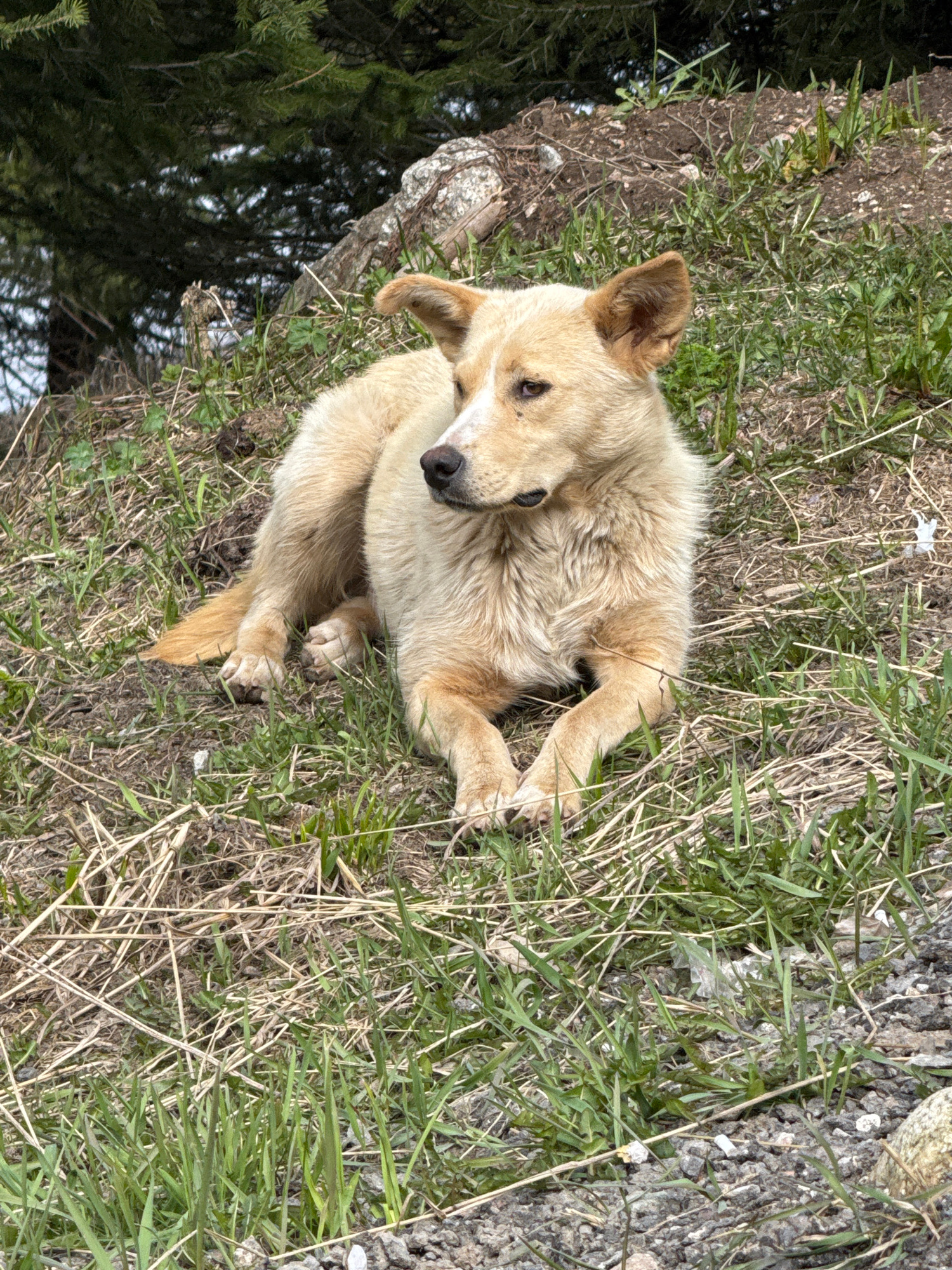 The image features a light-brown or tan dog lying curled up on the ground, observed from an overhead perspective. The dog has medium-length, somewhat shaggy fur and pointed ears, one of which is clear…read more