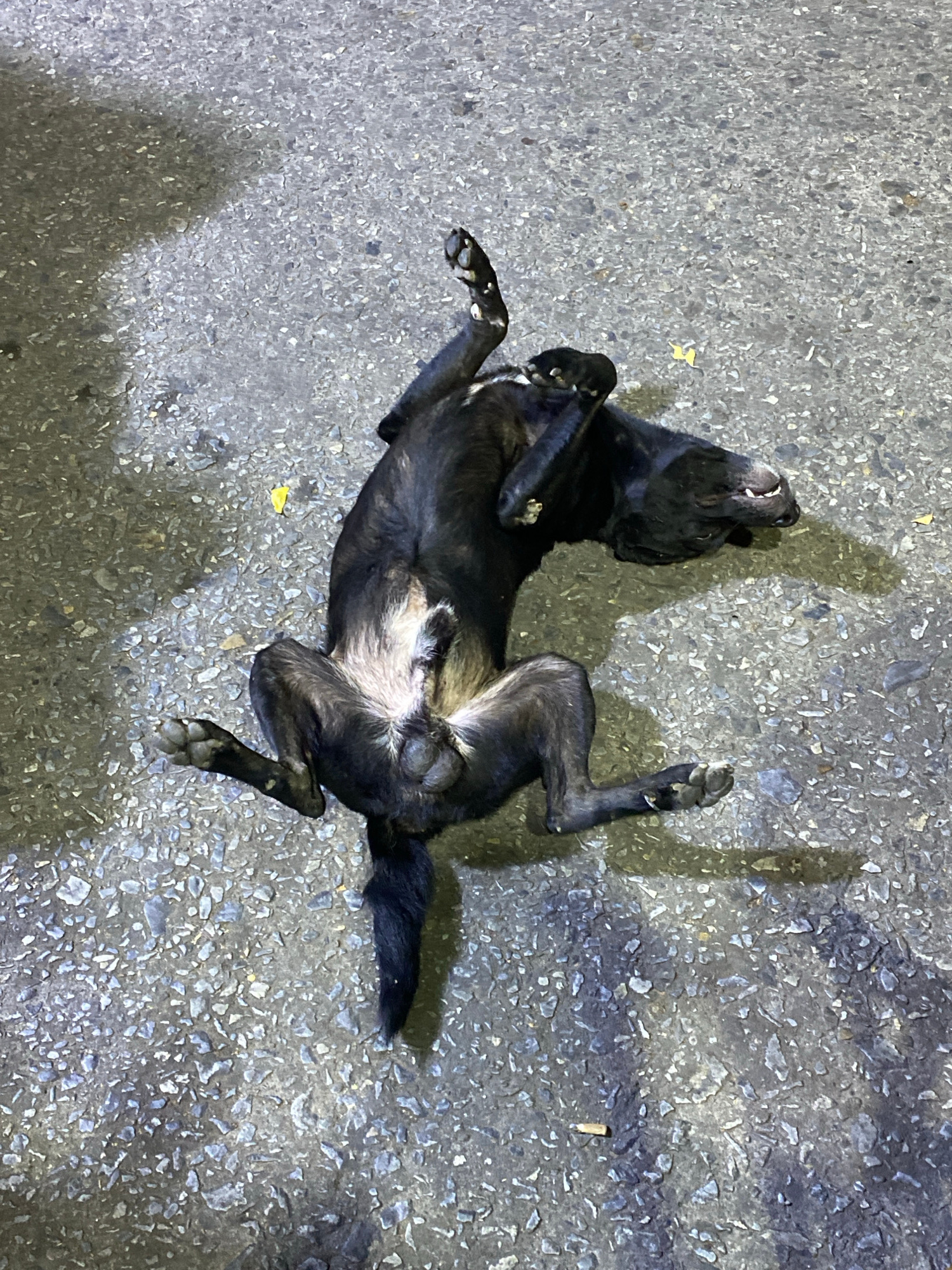 A black dog is lying on its back on a paved surface, likely concrete or asphalt. The dog's legs are extended in the air, and its mouth is open. The surface is gray and appears to be outdoors, possibly…read more