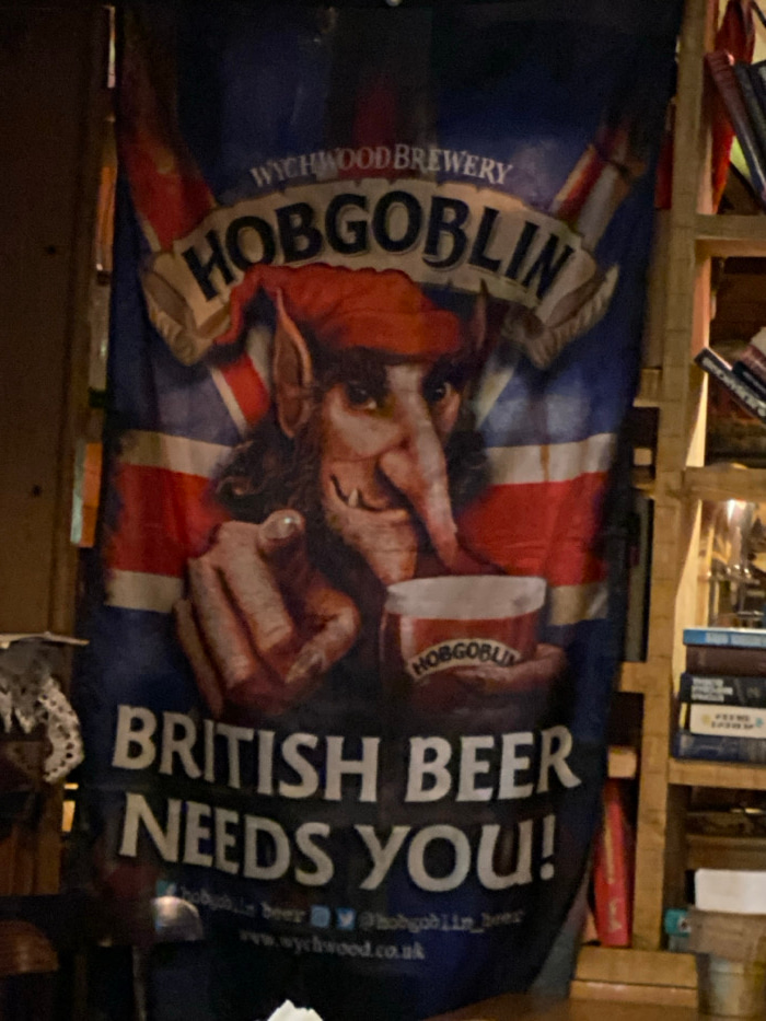 A banner hangs against a background of wooden shelves filled with books and other items. The banner features a goblin-like figure with pointed ears and a red cap, superimposed on a stylized Union Jack…read more