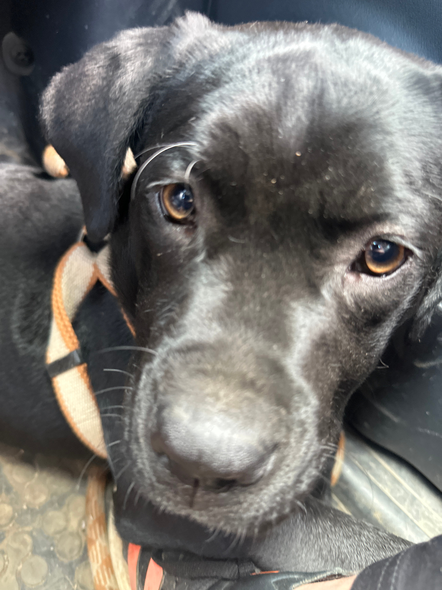 A close-up, low-angle view of a black Labrador Retriever dog. The dog is wearing a brown and black collar. The dog's eyes are brown. The environment appears to be indoors. No indication of the city of…read more
